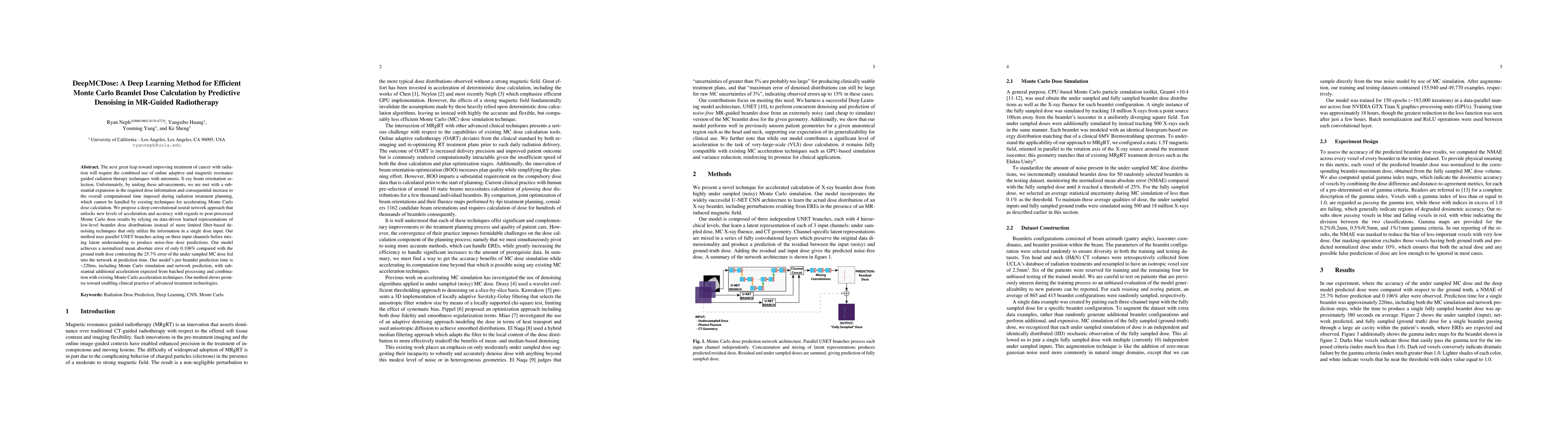DeepMCDose employs a deep convolutional neural network to accelerate Monte Carlo beamlet dose calculations in MR-guided radiotherapy, achieving a 0.106% normalized mean absolute error compared to ground truth, significantly outperforming undersampled Monte Carlo dose predictions. The method promises substantial computational time reduction, enabling the clinical adoption of advanced radiotherapy techniques.