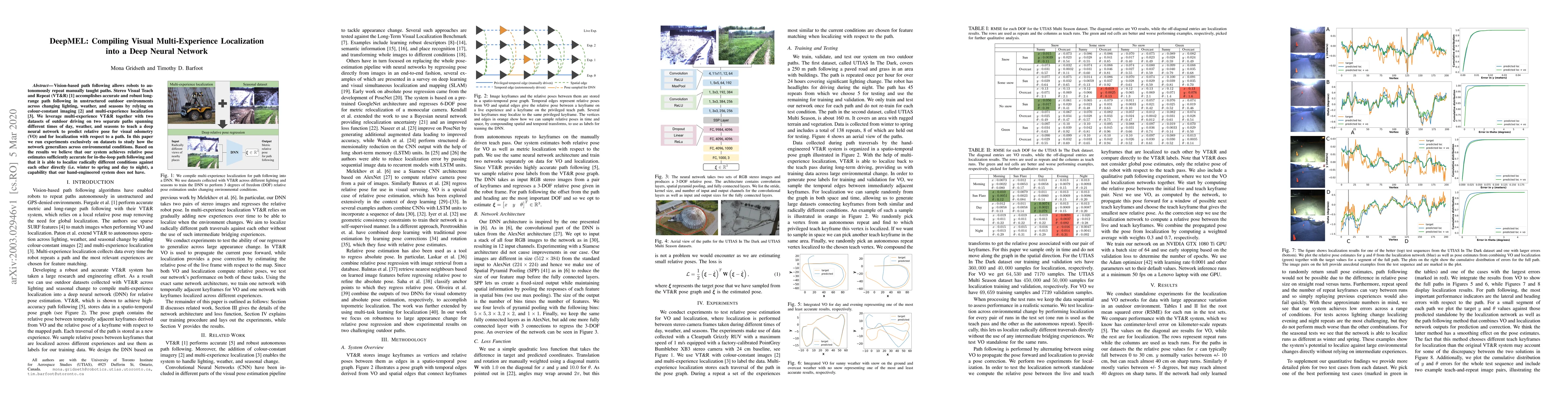 Vision-based path following allows robots to autonomously repeat manually taught paths. Stereo Visual Teach and Repeat (VT\&R) accomplishes accurate and robust long-range path following in unstructured outdoor environments across changing lighting, weather, and seasons by relying on colour-constant imaging and multi-experience localization. We leverage multi-experience VT\&R together with two datasets of outdoor driving on two separate paths spanning different times of day, weather, and seasons to teach a deep neural network to predict relative pose for visual odometry (VO) and for localization with respect to a path. In this paper we run experiments exclusively on datasets to study how the network generalizes across environmental conditions. Based on the results we believe that our system achieves relative pose estimates sufficiently accurate for in-the-loop path following and that it is able to localize radically different conditions against each other directly (i.e. winter to spring and day to night), a capability that our hand-engineered system does not have.