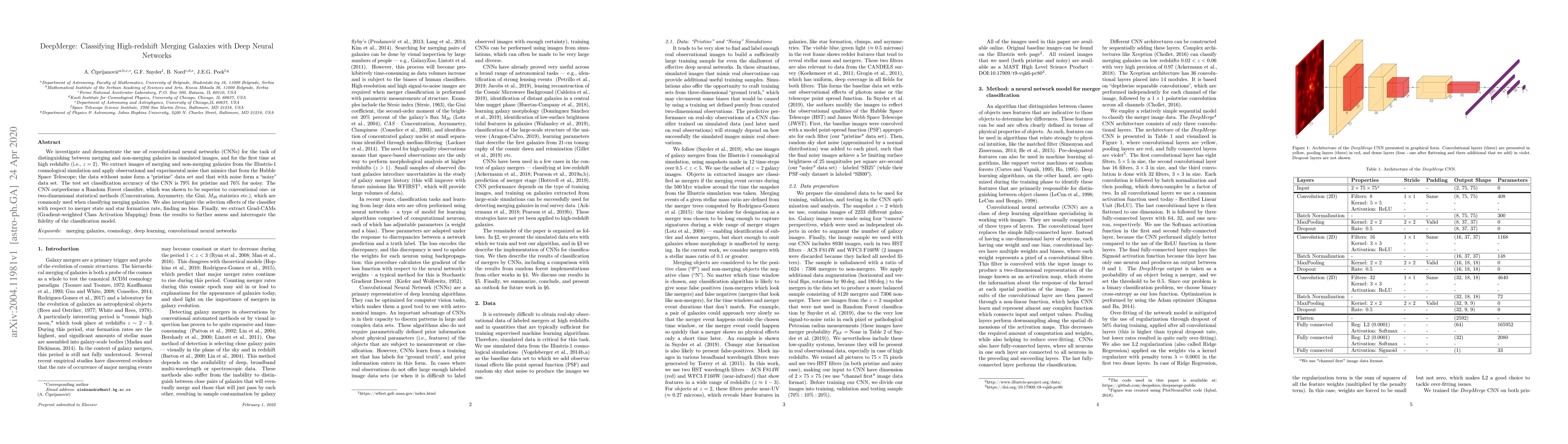 DeepMerge employs convolutional neural networks (CNNs) to classify high-redshift merging galaxies from simulated images, achieving 79% accuracy on pristine data and 76% on noisy data. The CNN outperforms traditional statistical methods and Random Forest classifiers, demonstrating no selection bias and providing interpretable Grad-CAMs for model fidelity assessment.