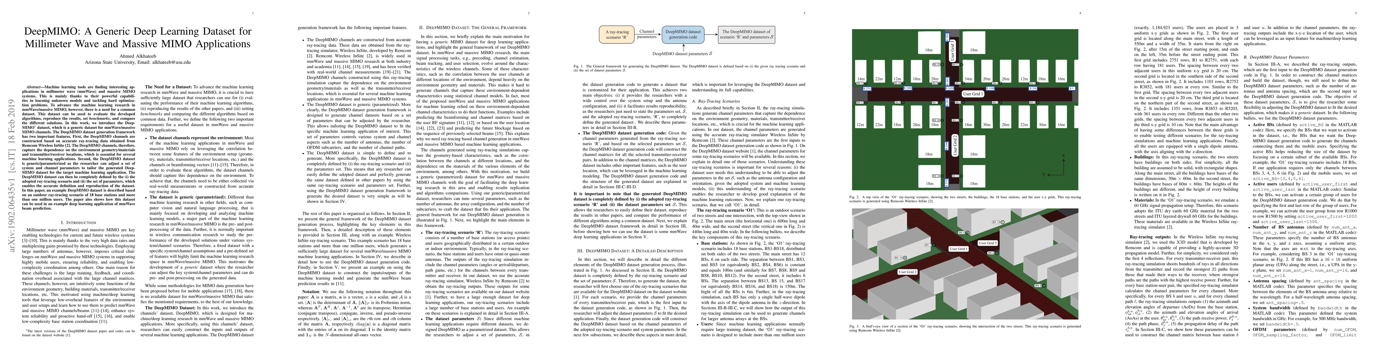 Machine learning tools are finding interesting applications in millimeter wave (mmWave) and massive MIMO systems. This is mainly thanks to their powerful capabilities in learning unknown models and tackling hard optimization problems. To advance the machine learning research in mmWave/massive MIMO, however, there is a need for a common dataset. This dataset can be used to evaluate the developed algorithms, reproduce the results, set benchmarks, and compare the different solutions. In this work, we introduce the DeepMIMO dataset, which is a generic dataset for mmWave/massive MIMO channels. The DeepMIMO dataset generation framework has two important features. First, the DeepMIMO channels are constructed based on accurate ray-tracing data obtained from Remcom Wireless InSite. The DeepMIMO channels, therefore, capture the dependence on the environment geometry/materials and transmitter/receiver locations, which is essential for several machine learning applications. Second, the DeepMIMO dataset is generic/parameterized as the researcher can adjust a set of system and channel parameters to tailor the generated DeepMIMO dataset for the target machine learning application. The DeepMIMO dataset can then be completely defined by the (i) the adopted ray-tracing scenario and (ii) the set of parameters, which enables the accurate definition and reproduction of the dataset. In this paper, an example DeepMIMO dataset is described based on an outdoor ray-tracing scenario of 18 base stations and more than one million users. The paper also shows how this dataset can be used in an example deep learning application of mmWave beam prediction.