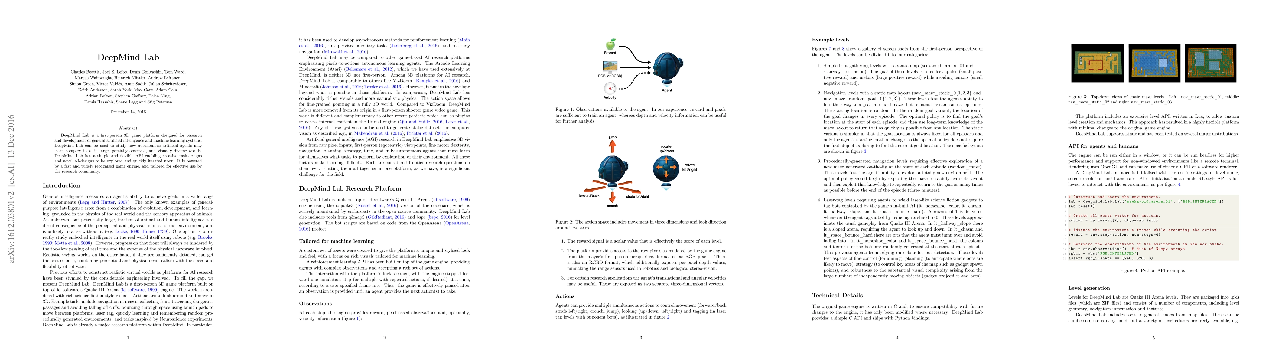 DeepMind Lab is a first-person 3D game platform designed for research and development of general artificial intelligence and machine learning systems. DeepMind Lab can be used to study how autonomous artificial agents may learn complex tasks in large, partially observed, and visually diverse worlds. DeepMind Lab has a simple and flexible API enabling creative task-designs and novel AI-designs to be explored and quickly iterated upon. It is powered by a fast and widely recognised game engine, and tailored for effective use by the research community.