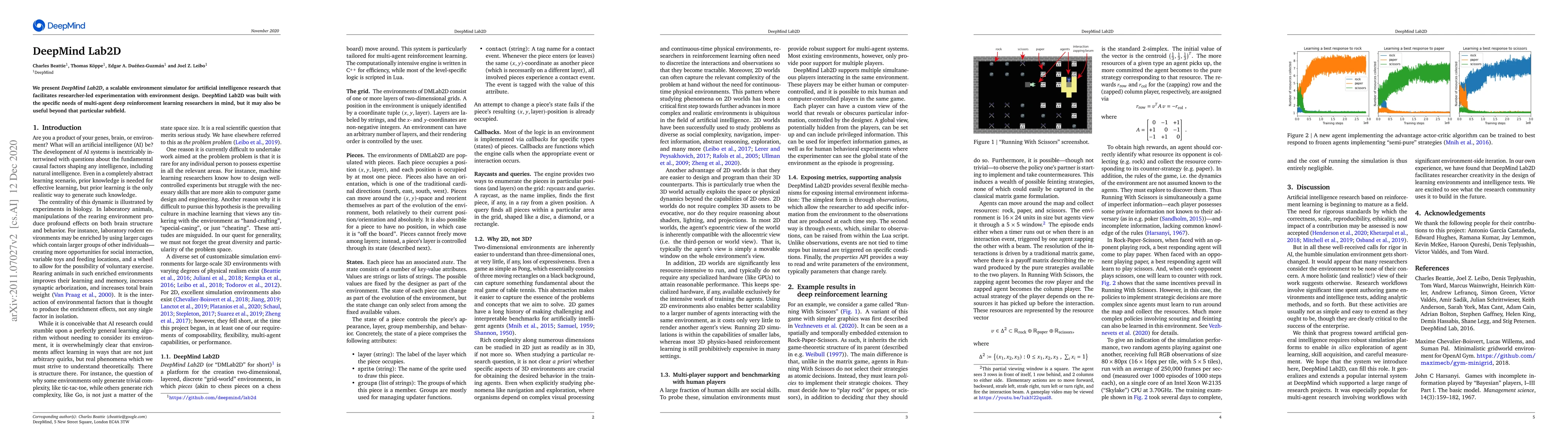 DeepMind Lab2D is a scalable environment simulator designed for AI research, particularly for multi-agent deep reinforcement learning, enabling researcher-led experimentation with flexible environment design. Its utility extends beyond reinforcement learning, offering broader applications in AI research.