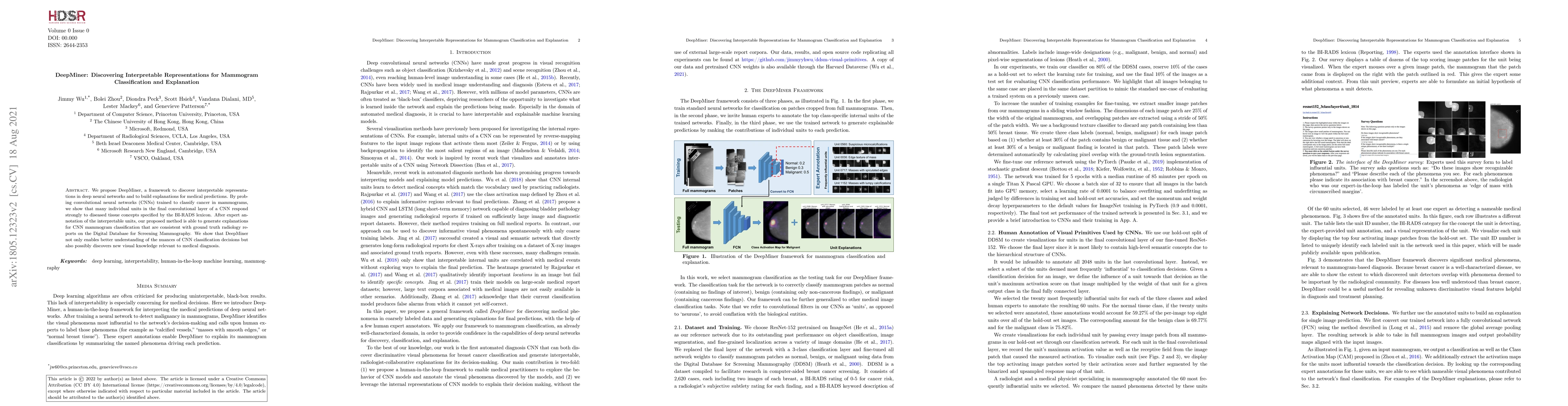 We propose DeepMiner, a framework to discover interpretable representations in deep neural networks and to build explanations for medical predictions. By probing convolutional neural networks (CNNs) trained to classify cancer in mammograms, we show that many individual units in the final convolutional layer of a CNN respond strongly to diseased tissue concepts specified by the BI-RADS lexicon. After expert annotation of the interpretable units, our proposed method is able to generate explanations for CNN mammogram classification that are consistent with ground truth radiology reports on the Digital Database for Screening Mammography. We show that DeepMiner not only enables better understanding of the nuances of CNN classification decisions but also possibly discovers new visual knowledge relevant to medical diagnosis.
