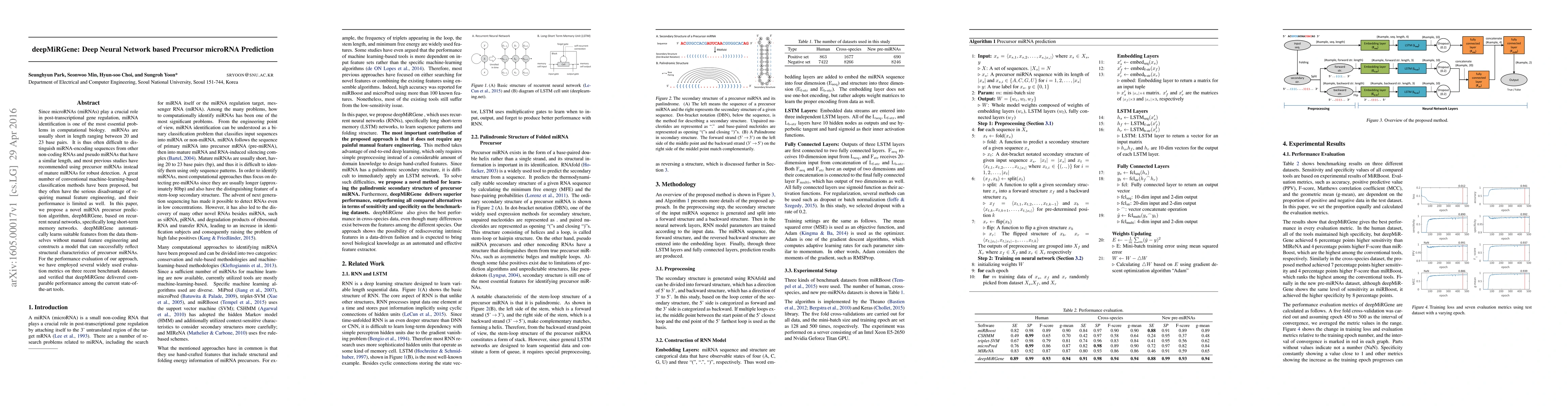 The paper introduces deepMiRGene, a novel miRNA precursor prediction algorithm based on long short-term memory networks, which automatically learns features without manual engineering, achieving competitive performance compared to existing tools. The method demonstrates robust detection of precursor miRNAs, addressing the challenge of distinguishing them from similar sequences.