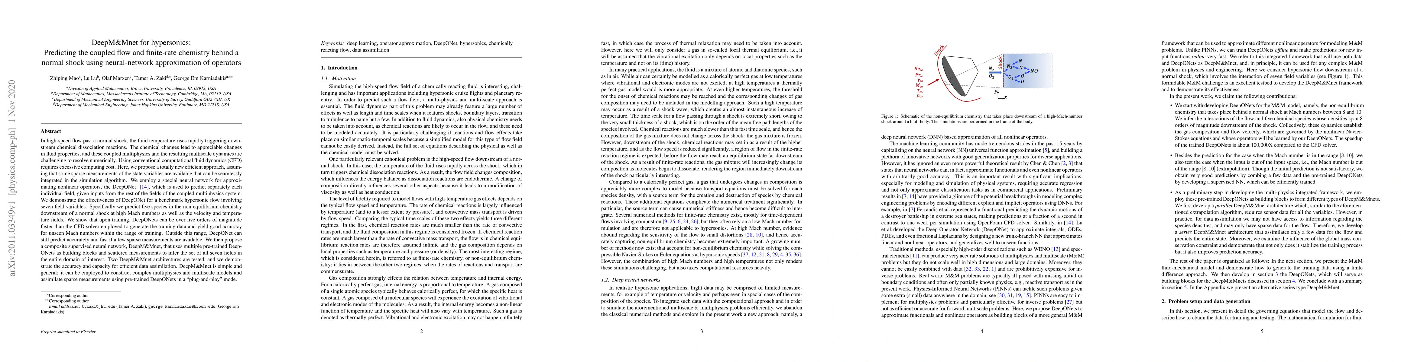 In high-speed flow past a normal shock, the fluid temperature rises rapidly triggering downstream chemical dissociation reactions. The chemical changes lead to appreciable changes in fluid properties, and these coupled multiphysics and the resulting multiscale dynamics are challenging to resolve numerically. Using conventional computational fluid dynamics (CFD) requires excessive computing cost. Here, we propose a totally new efficient approach, assuming that some sparse measurements of the state variables are available that can be seamlessly integrated in the simulation algorithm. We employ a special neural network for approximating nonlinear operators, the DeepONet, which is used to predict separately each individual field, given inputs from the rest of the fields of the coupled multiphysics system. We demonstrate the effectiveness of DeepONet by predicting five species in the non-equilibrium chemistry downstream of a normal shock at high Mach numbers as well as the velocity and temperature fields. We show that upon training, DeepONets can be over five orders of magnitude faster than the CFD solver employed to generate the training data and yield good accuracy for unseen Mach numbers within the range of training. Outside this range, DeepONet can still predict accurately and fast if a few sparse measurements are available. We then propose a composite supervised neural network, DeepM&Mnet, that uses multiple pre-trained DeepONets as building blocks and scattered measurements to infer the set of all seven fields in the entire domain of interest. Two DeepM&Mnet architectures are tested, and we demonstrate the accuracy and capacity for efficient data assimilation. DeepM&Mnet is simple and general: it can be employed to construct complex multiphysics and multiscale models and assimilate sparse measurements using pre-trained DeepONets in a "plug-and-play" mode.