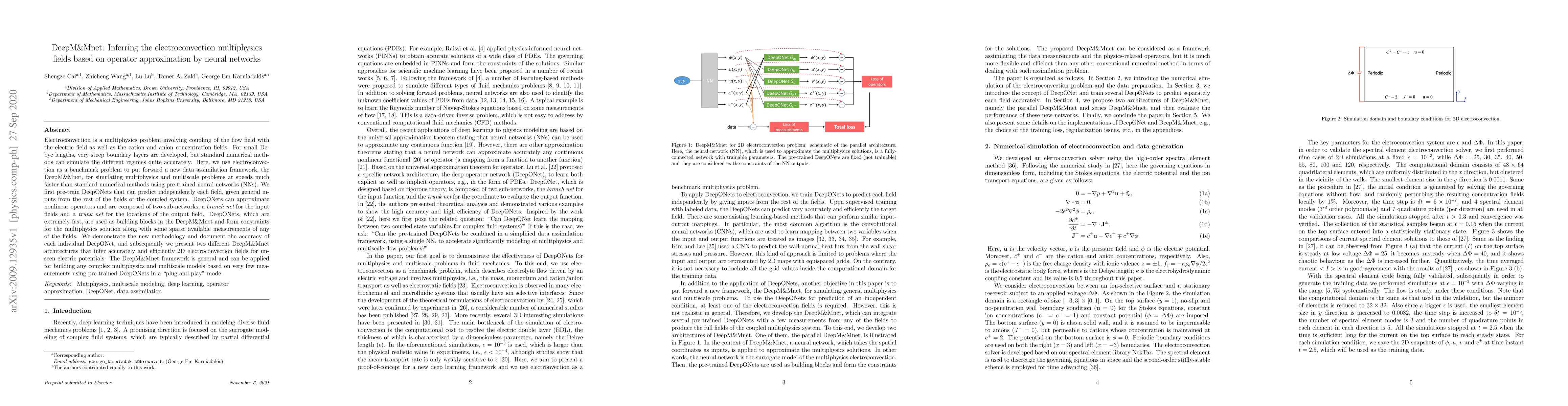Electroconvection is a multiphysics problem involving coupling of the flow field with the electric field as well as the cation and anion concentration fields. For small Debye lengths, very steep boundary layers are developed, but standard numerical methods can simulate the different regimes quite accurately. Here, we use electroconvection as a benchmark problem to put forward a new data assimilation framework, the DeepM&Mnet, for simulating multiphysics and multiscale problems at speeds much faster than standard numerical methods using pre-trained neural networks (NNs). We first pre-train DeepONets that can predict independently each field, given general inputs from the rest of the fields of the coupled system. DeepONets can approximate nonlinear operators and are composed of two sub-networks, a branch net for the input fields and a trunk net for the locations of the output field. DeepONets, which are extremely fast, are used as building blocks in the DeepM&Mnet and form constraints for the multiphysics solution along with some sparse available measurements of any of the fields. We demonstrate the new methodology and document the accuracy of each individual DeepONet, and subsequently we present two different DeepM&Mnet architectures that infer accurately and efficiently 2D electroconvection fields for unseen electric potentials. The DeepM&Mnet framework is general and can be applied for building any complex multiphysics and multiscale models based on very few measurements using pre-trained DeepONets in a plug-and-play mode.