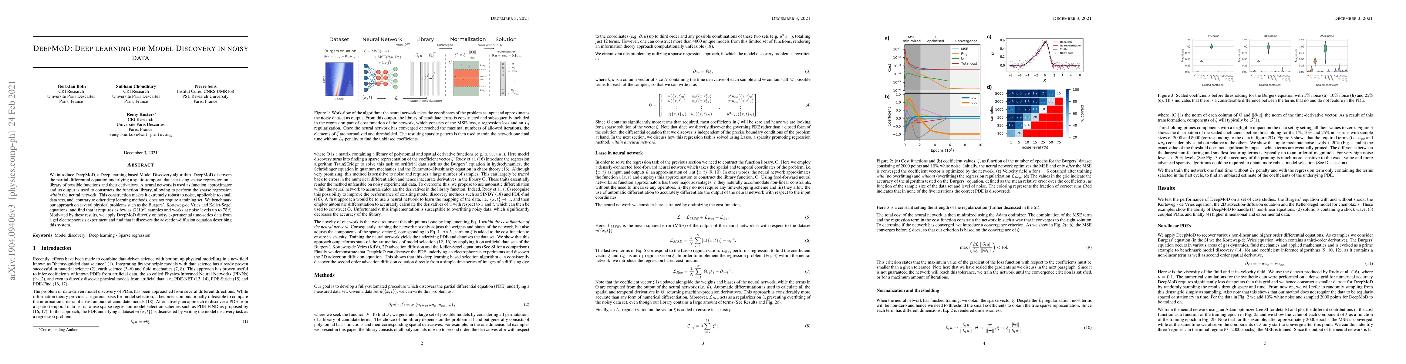 DeepMoD is a novel deep learning algorithm for discovering underlying partial differential equations from noisy spatio-temporal data using sparse regression. It leverages neural networks to construct and approximate data, demonstrating robustness to noise and applicability to small datasets without requiring a training set.