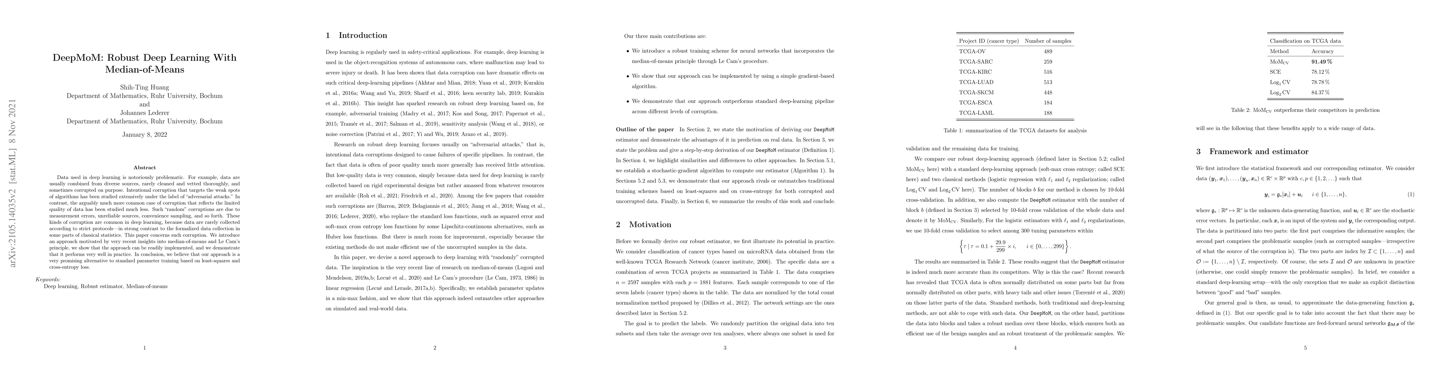 Data used in deep learning is notoriously problematic. For example, data are usually combined from diverse sources, rarely cleaned and vetted thoroughly, and sometimes corrupted on purpose. Intentional corruption that targets the weak spots of algorithms has been studied extensively under the label of "adversarial attacks." In contrast, the arguably much more common case of corruption that reflects the limited quality of data has been studied much less. Such "random" corruptions are due to measurement errors, unreliable sources, convenience sampling, and so forth. These kinds of corruption are common in deep learning, because data are rarely collected according to strict protocols -- in strong contrast to the formalized data collection in some parts of classical statistics. This paper concerns such corruption. We introduce an approach motivated by very recent insights into median-of-means and Le Cam's principle, we show that the approach can be readily implemented, and we demonstrate that it performs very well in practice. In conclusion, we believe that our approach is a very promising alternative to standard parameter training based on least-squares and cross-entropy loss.