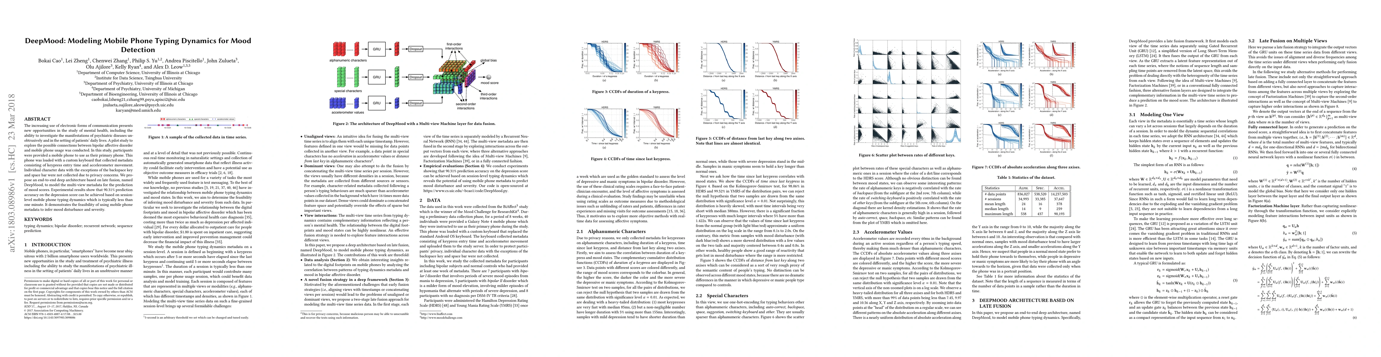 DeepMood employs a deep architecture to model mobile phone typing dynamics from keypress time and accelerometer data to predict mood scores, achieving 90.31% accuracy in depression score prediction, indicating potential for unobtrusive mood detection in daily life.
