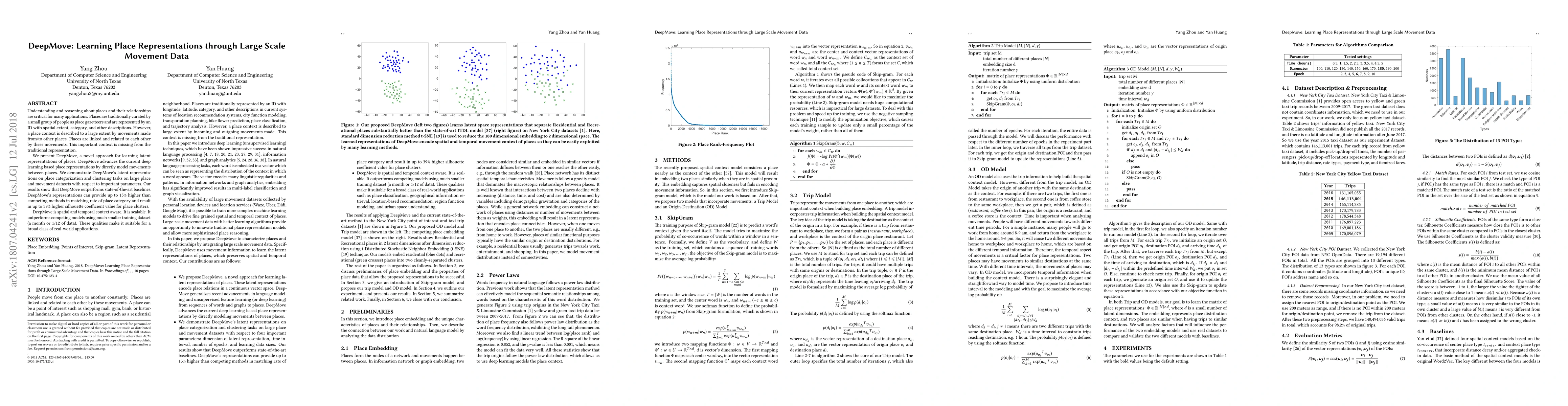 DeepMove is a novel approach for learning latent representations of places by modeling movements between them, significantly improving place categorization and clustering. It outperforms state-of-the-art baselines by up to 15% in matching rates and 39% in clustering quality, demonstrating scalability and efficiency even with limited data.