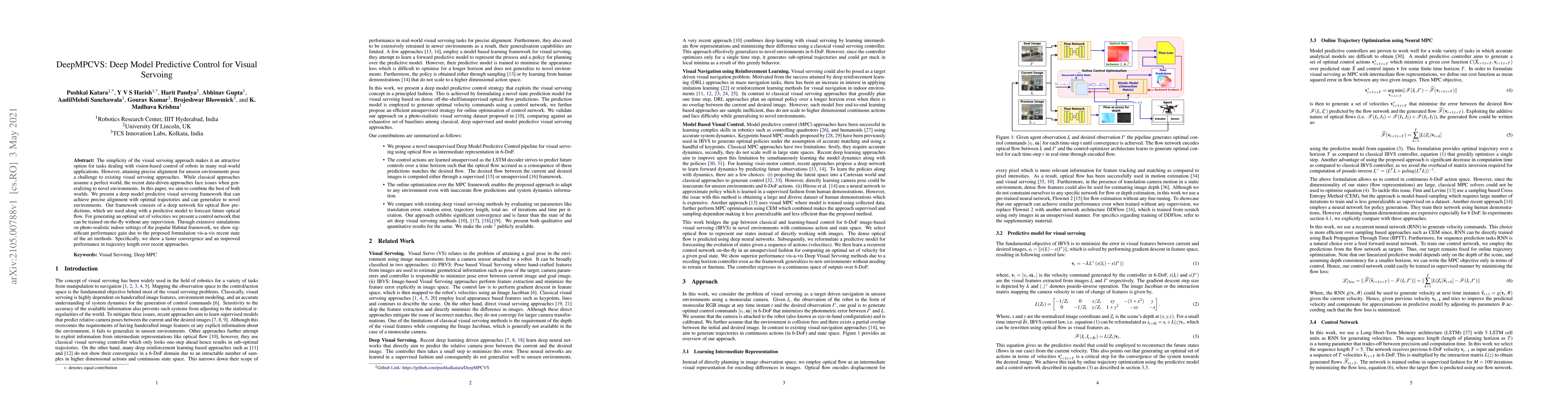 This paper presents DeepMPCVS, a deep model predictive visual servoing framework that combines classical and data-driven approaches for precise alignment and generalization in unseen environments. The proposed method uses a deep network for optical flow predictions and a control network trained on the fly to generate optimal velocities, demonstrating faster convergence and improved trajectory length in simulations.