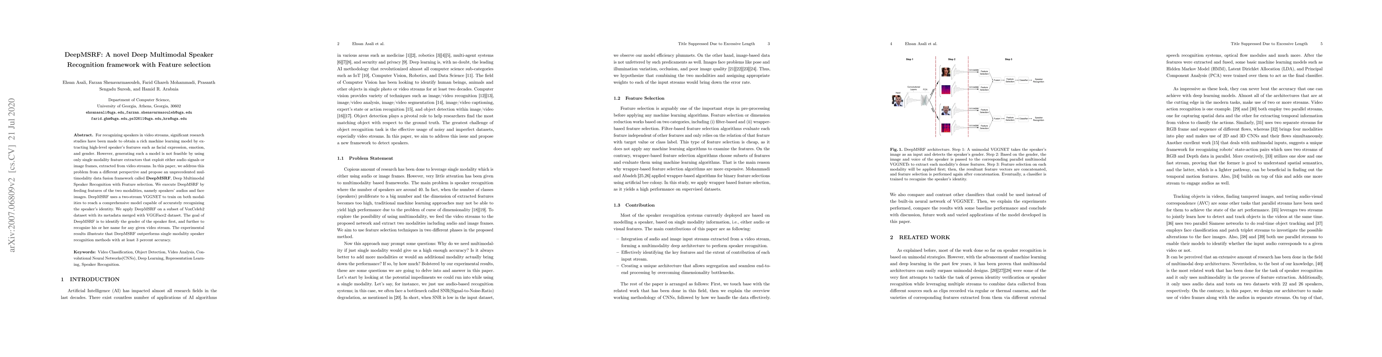 DeepMSRF, a novel deep multimodal speaker recognition framework with feature selection, which utilizes a two-stream VGGNET for training on audio and face image features, significantly improves speaker recognition accuracy.