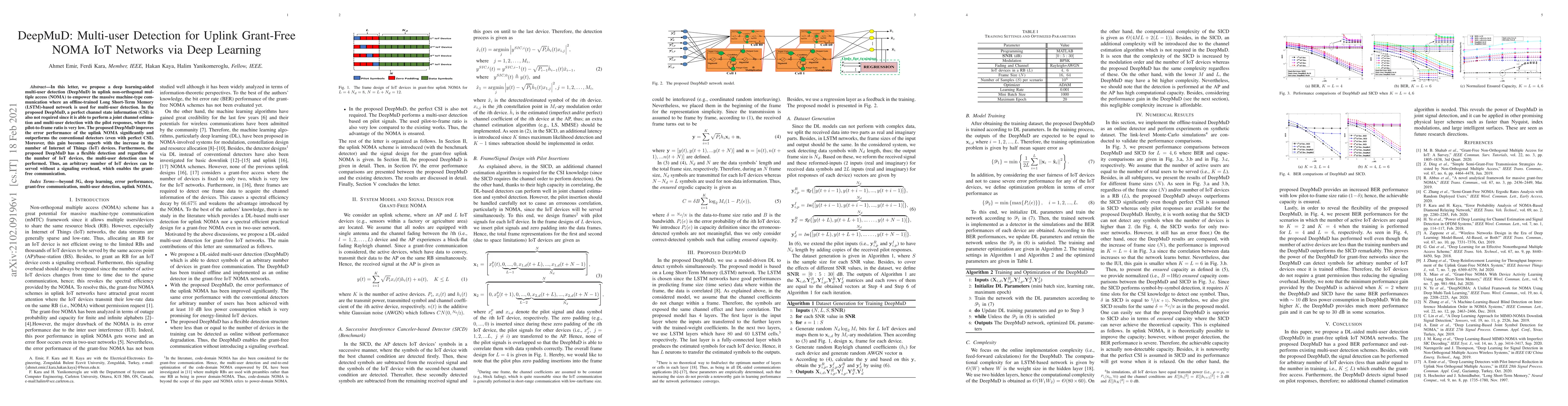 A new deep learning-based system called DeepMuD improves uplink grant-free NOMA IoT networks by enabling multi-user detection with low pilot-to-frame ratio, outperforming conventional detectors even with perfect CSI, and supporting an arbitrary number of IoT devices.