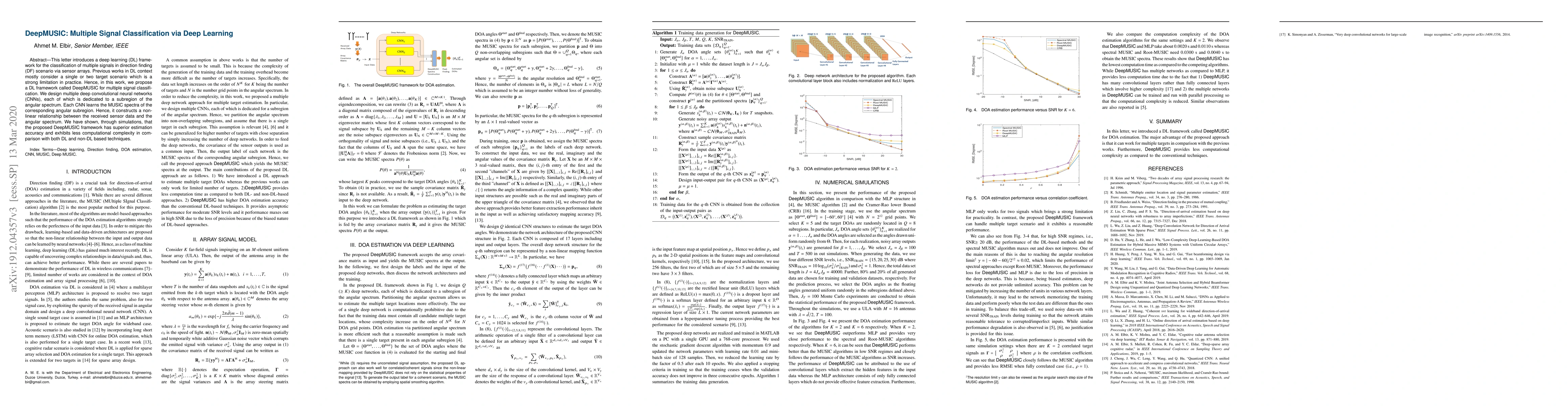 This paper introduces DeepMUSIC, a deep learning framework for multiple signal classification and direction-of-arrival estimation, utilizing multiple deep convolutional neural networks to enhance accuracy and reduce computational complexity compared to existing methods. Simulation results demonstrate superior performance of DeepMUSIC.