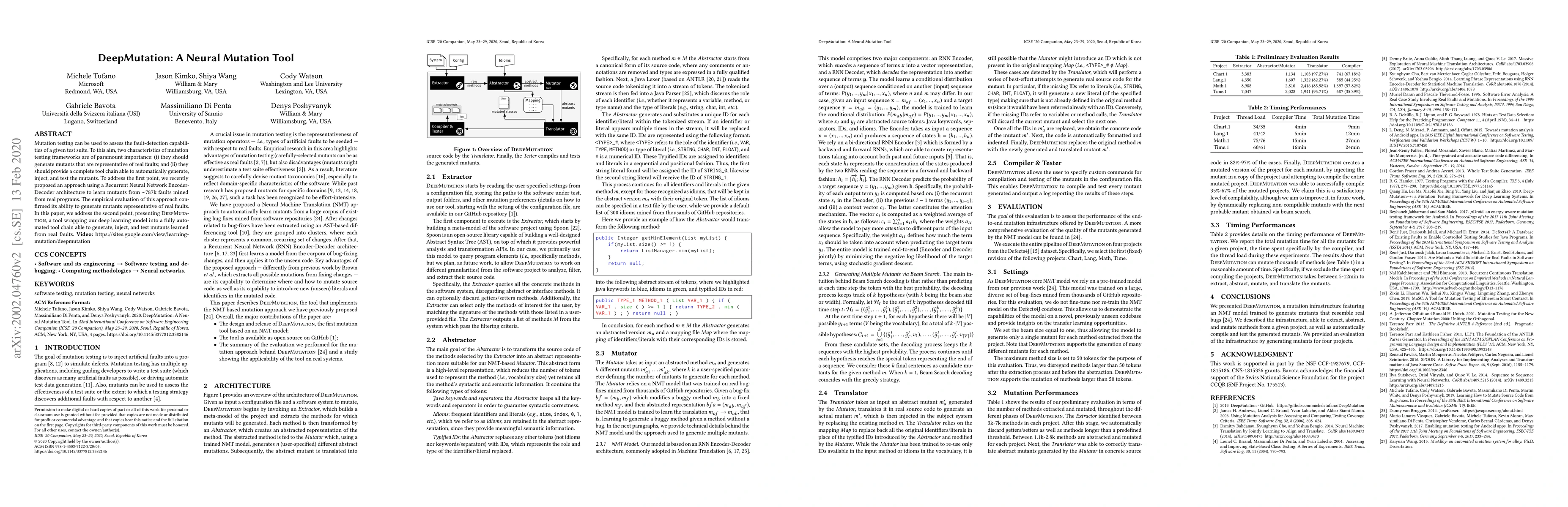 DeepMutation is a neural mutation tool that automates the generation, injection, and testing of mutants based on a deep learning model trained on real faults. This tool aims to enhance mutation testing by providing a complete framework for assessing the fault-detection capabilities of test suites.