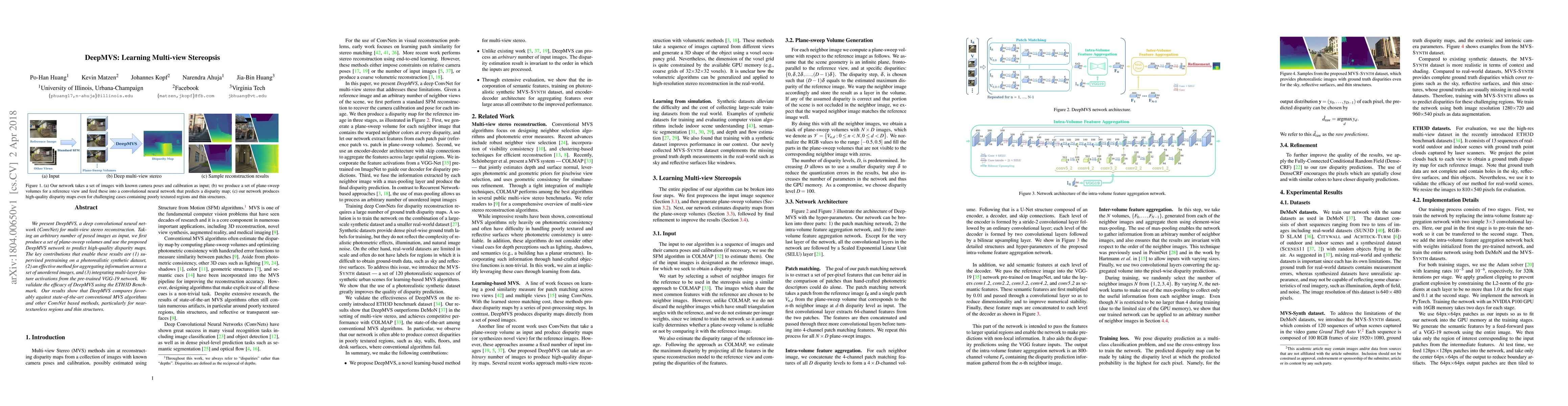 DeepMVS is a deep learning method for multi-view stereo reconstruction, using ConvNets to generate high-quality disparity maps from posed images. It employs pretrained synthetic data, efficient image information aggregation, and VGG-19 feature integration, outperforming conventional and ConvNet-based methods, especially in challenging near-textureless and thin structure regions.