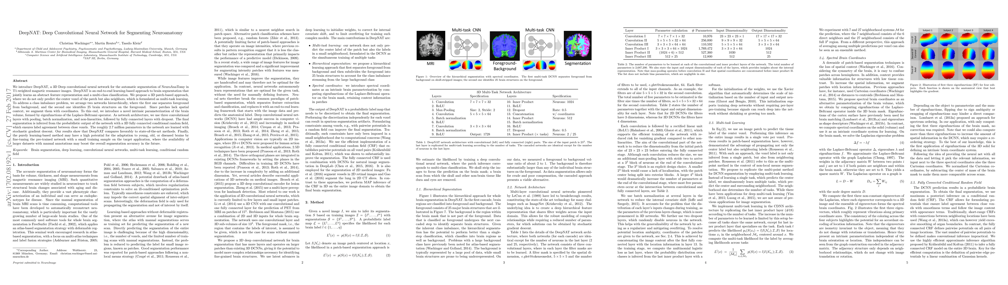 DeepNAT is a 3D convolutional neural network designed for automatic segmentation of neuroanatomy in T1-weighted MRIs, employing a hierarchical network to address class imbalance and incorporating spatial context through eigenfunction parameterization. It outperforms state-of-the-art methods and shows potential for adaptation via fine-tuning.