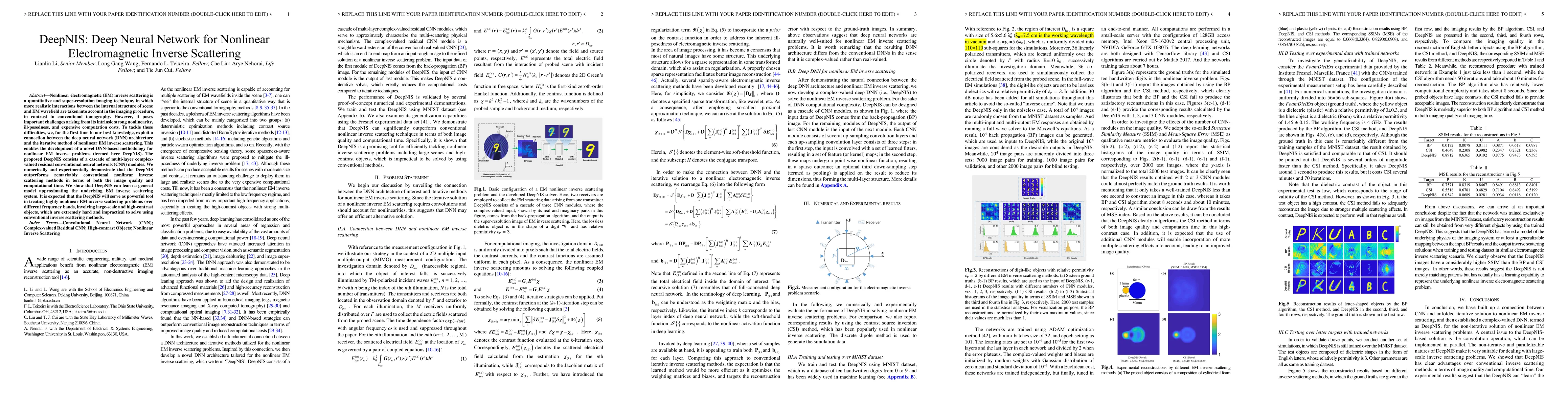 The paper introduces DeepNIS, a deep neural network methodology for nonlinear electromagnetic inverse scattering, which leverages a connection between DNN architecture and iterative methods to overcome challenges of nonlinearity, ill-posedness, and computational costs. DeepNIS outperforms conventional methods in image quality and computational efficiency.