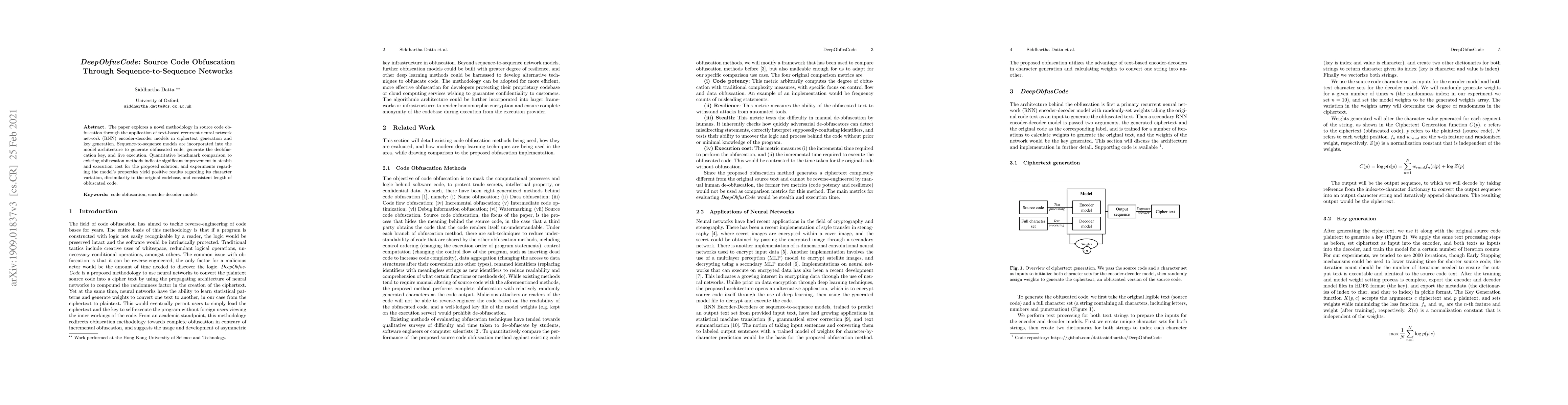 The paper explores a novel methodology in source code obfuscation through the application of text-based recurrent neural network (RNN) encoder-decoder models in ciphertext generation and key generation. Sequence-to-sequence models are incorporated into the model architecture to generate obfuscated code, generate the deobfuscation key, and live execution. Quantitative benchmark comparison to existing obfuscation methods indicate significant improvement in stealth and execution cost for the proposed solution, and experiments regarding the model's properties yield positive results regarding its character variation, dissimilarity to the original codebase, and consistent length of obfuscated code.
