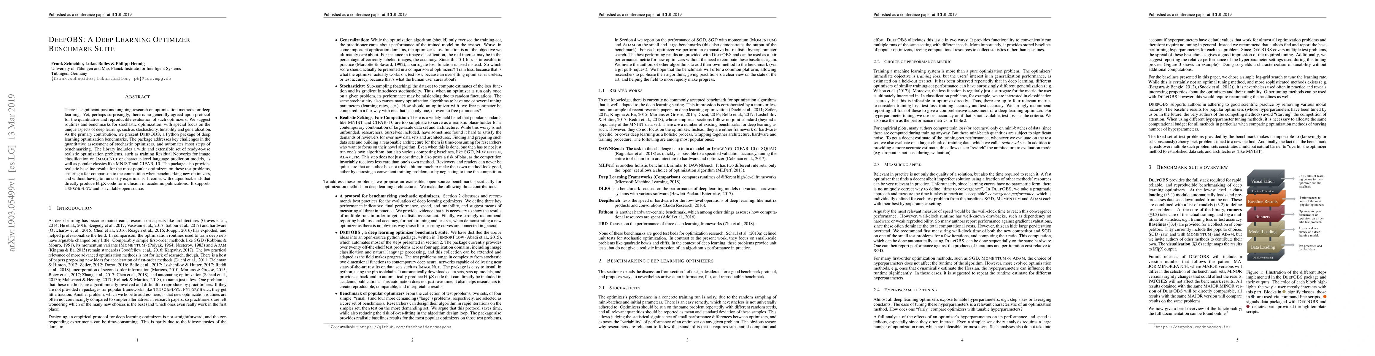 The research introduces DeepOBS, a Python benchmark suite for evaluating deep learning optimizers. It provides standardized routines, benchmarks focusing on deep learning aspects, and realistic optimization problems with baseline results for popular optimizers. DeepOBS automates benchmarking steps, supports TensorFlow, and offers LaTeX output for academic publications, addressing the lack of a consistent evaluation protocol in the field.