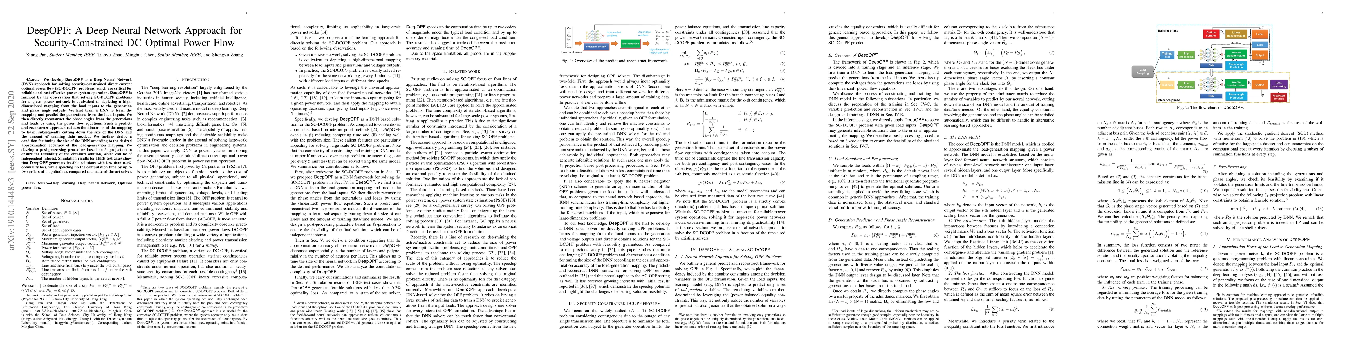 DeepOPF employs a Deep Neural Network (DNN) to solve security-constrained DC optimal power flow problems efficiently. It predicts generation from load inputs and reconstructs phase angles, reducing DNN size and training data, while ensuring solution feasibility through $\ell_1$-projection.
