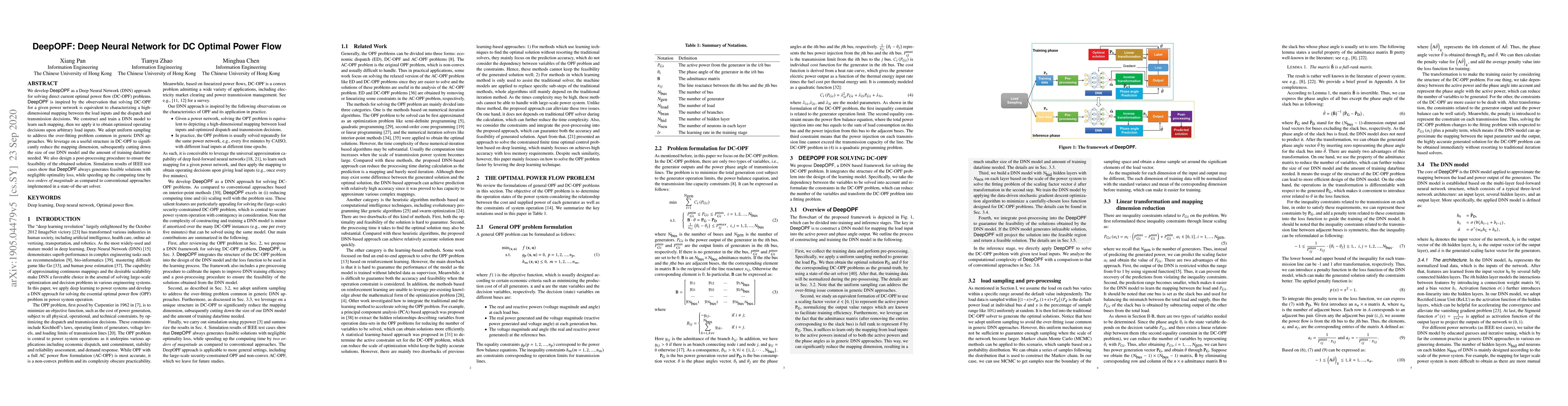 DeepOPF is a Deep Neural Network designed to solve direct current optimal power flow (DC-OPF) problems efficiently. It leverages a high-dimensional mapping approach to learn optimal dispatch and transmission decisions, significantly reducing model size and training time while ensuring solution feasibility.