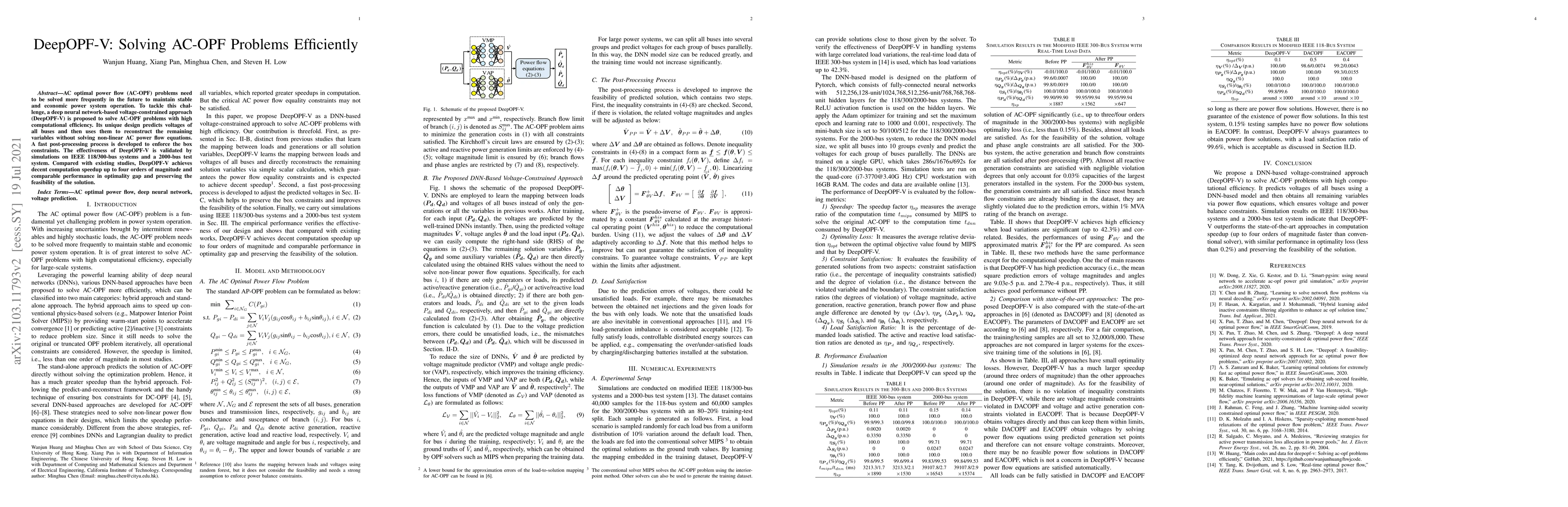The paper proposes DeepOPF-V, a deep neural network-based method for solving AC optimal power flow problems efficiently by predicting voltages and reconstructing variables without solving non-linear equations. Simulations show it achieves up to four orders of magnitude faster computation compared to existing methods while maintaining solution feasibility and optimality.
