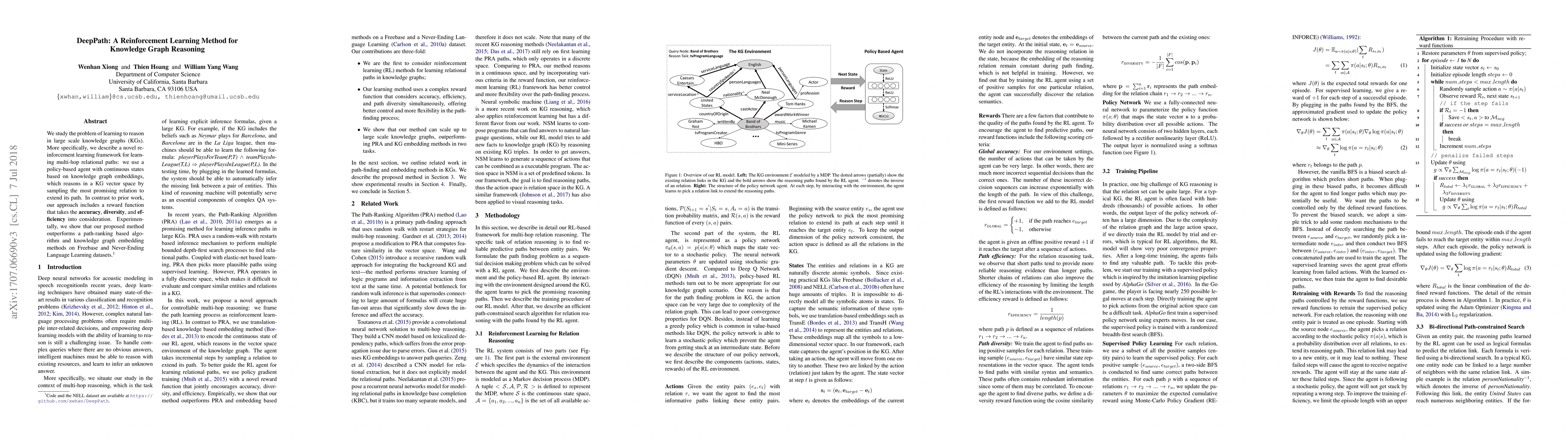 DeepPath introduces a reinforcement learning framework for multi-hop reasoning in large-scale knowledge graphs, utilizing a policy-based agent with continuous states based on graph embeddings. The method outperforms existing algorithms by incorporating a reward function that balances accuracy, diversity, and efficiency.