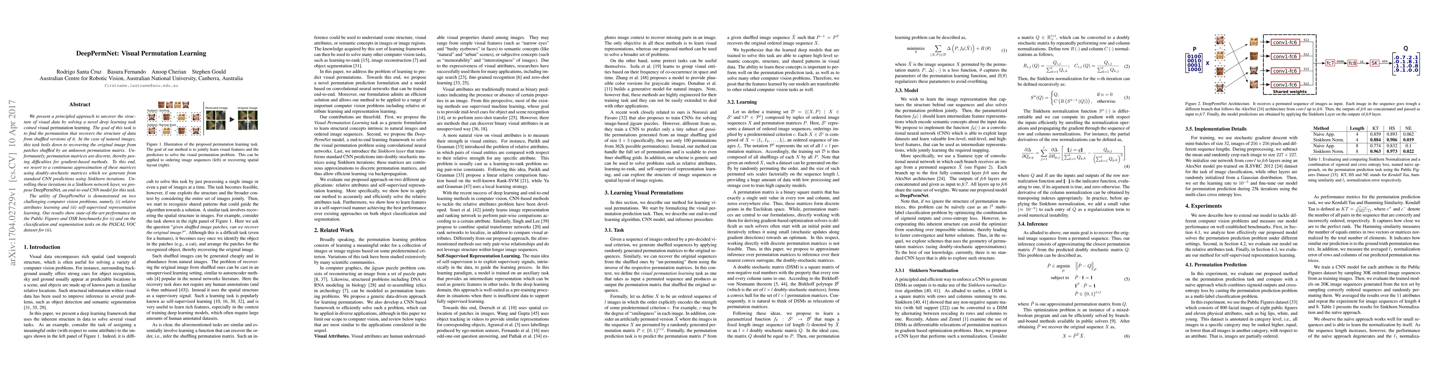 We present a principled approach to uncover the structure of visual data by solving a novel deep learning task coined visual permutation learning. The goal of this task is to find the permutation that recovers the structure of data from shuffled versions of it. In the case of natural images, this task boils down to recovering the original image from patches shuffled by an unknown permutation matrix. Unfortunately, permutation matrices are discrete, thereby posing difficulties for gradient-based methods. To this end, we resort to a continuous approximation of these matrices using doubly-stochastic matrices which we generate from standard CNN predictions using Sinkhorn iterations. Unrolling these iterations in a Sinkhorn network layer, we propose DeepPermNet, an end-to-end CNN model for this task. The utility of DeepPermNet is demonstrated on two challenging computer vision problems, namely, (i) relative attributes learning and (ii) self-supervised representation learning. Our results show state-of-the-art performance on the Public Figures and OSR benchmarks for (i) and on the classification and segmentation tasks on the PASCAL VOC dataset for (ii).