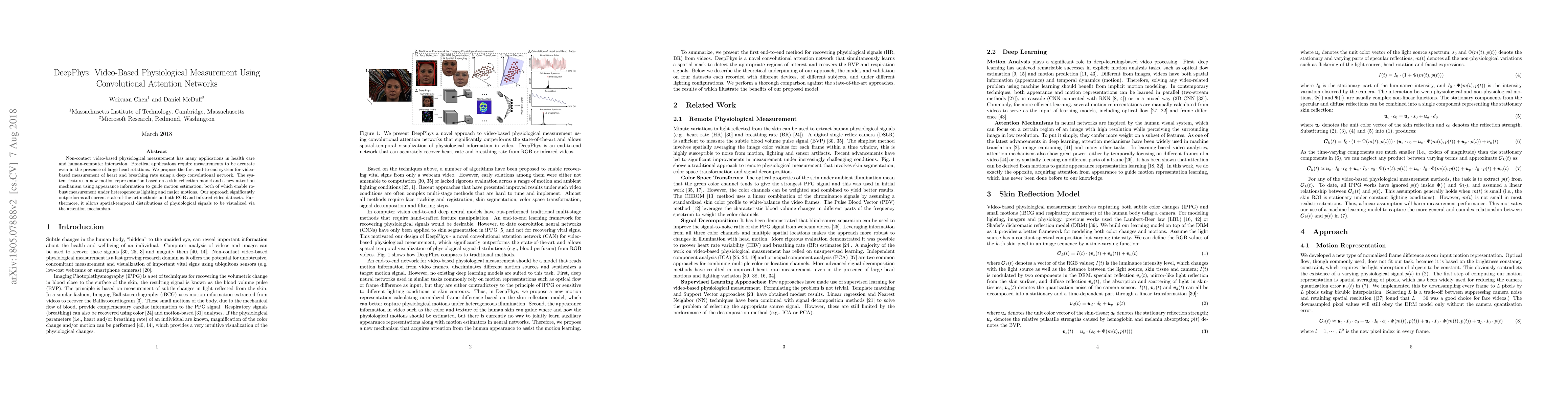 DeepPhys introduces an end-to-end video-based system for accurate measurement of heart and breathing rates using convolutional attention networks, achieving superior performance even with large head rotations and varying lighting conditions. The system visualizes physiological signal distributions through an innovative attention mechanism.