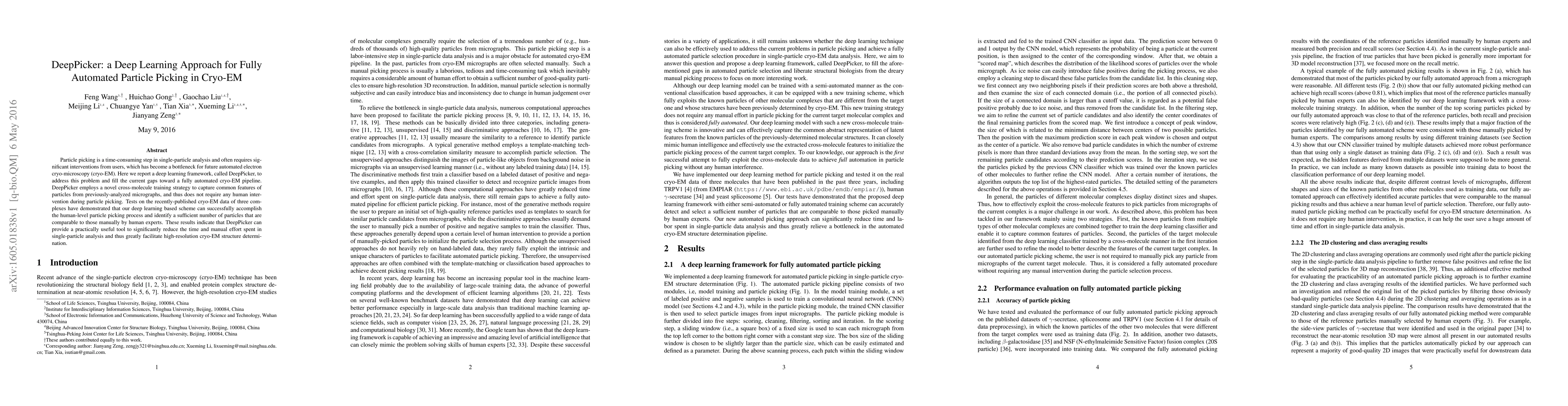 Particle picking is a time-consuming step in single-particle analysis and often requires significant interventions from users, which has become a bottleneck for future automated electron cryo-microscopy (cryo-EM). Here we report a deep learning framework, called DeepPicker, to address this problem and fill the current gaps toward a fully automated cryo-EM pipeline. DeepPicker employs a novel cross-molecule training strategy to capture common features of particles from previously-analyzed micrographs, and thus does not require any human intervention during particle picking. Tests on the recently-published cryo-EM data of three complexes have demonstrated that our deep learning based scheme can successfully accomplish the human-level particle picking process and identify a sufficient number of particles that are comparable to those manually by human experts. These results indicate that DeepPicker can provide a practically useful tool to significantly reduce the time and manual effort spent in single-particle analysis and thus greatly facilitate high-resolution cryo-EM structure determination.