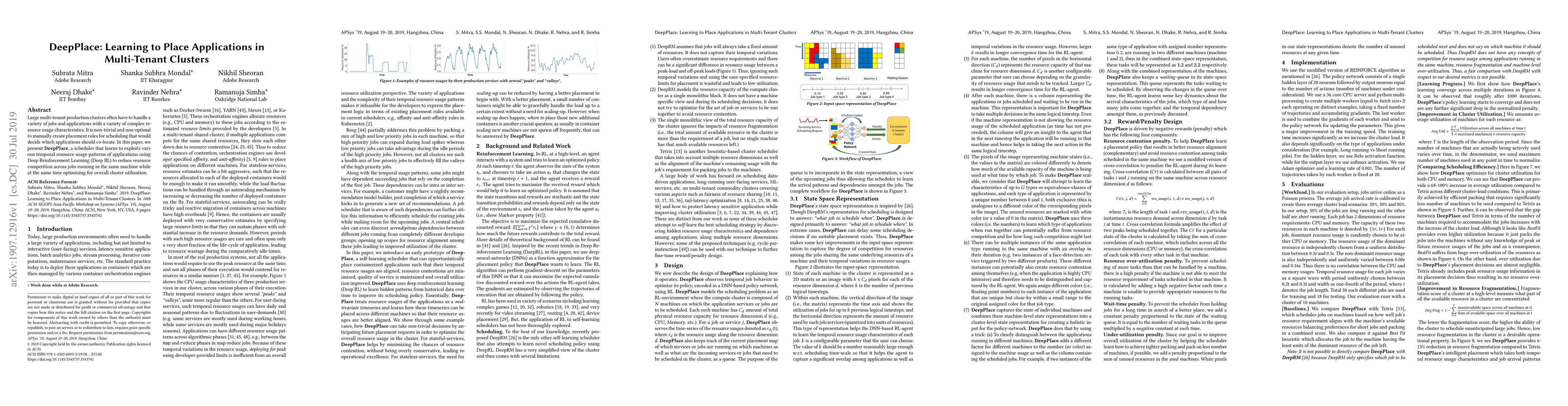 DeepPlace is a scheduler that uses Deep Reinforcement Learning to optimize application placement in multi-tenant clusters, reducing resource competition and improving cluster utilization by learning temporal resource usage patterns.