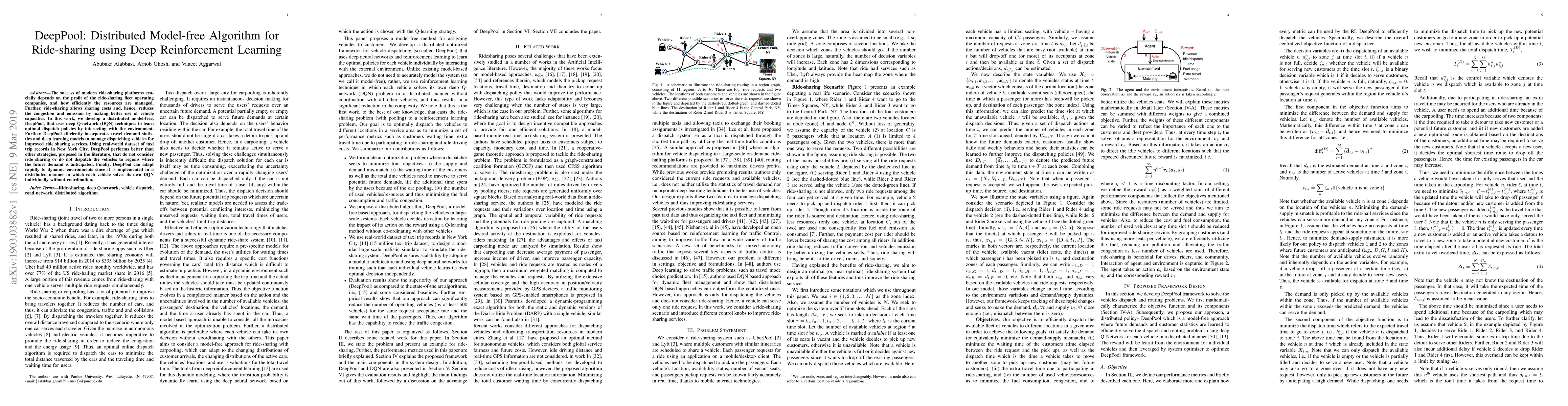 DeepPool is a distributed model-free algorithm using deep reinforcement learning to optimize ride-sharing dispatch policies. It outperforms other methods by efficiently managing vehicle capacities and adapting to dynamic environments through individual vehicle-based DQN implementations.