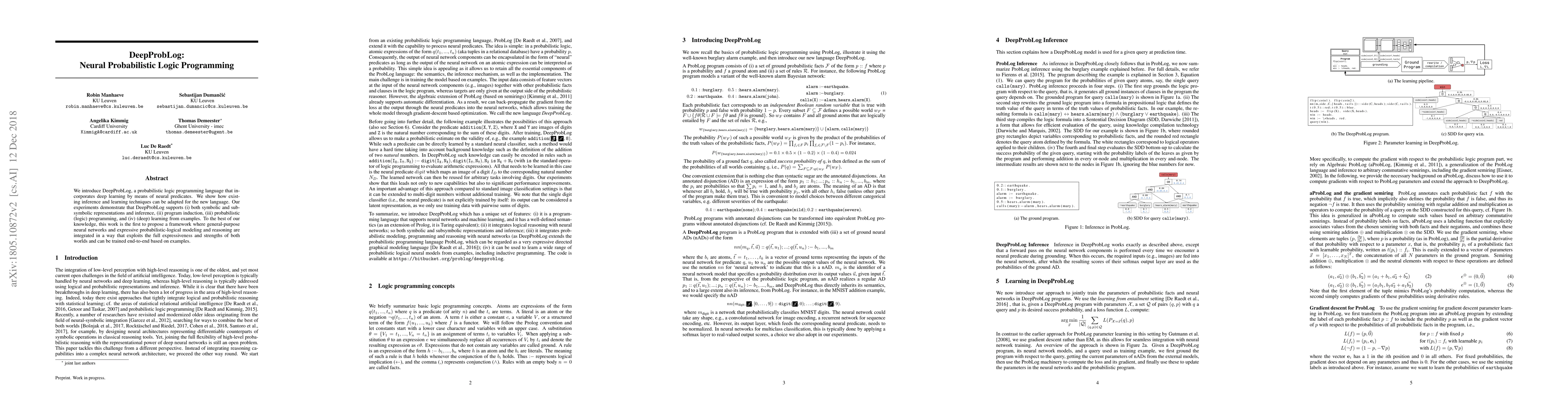 DeepProbLog combines neural predicates with probabilistic logic programming, enabling both symbolic and subsymbolic representations and inference, program induction, probabilistic programming, and deep learning from examples. This pioneering framework integrates general-purpose neural networks with expressive probabilistic-logical modeling, offering a unified approach for end-to-end training based on examples.