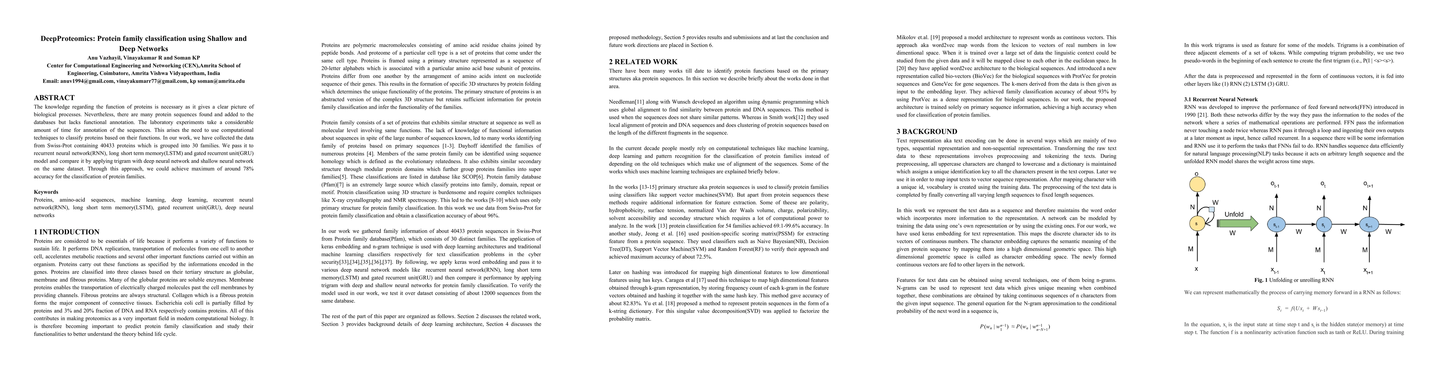 The knowledge regarding the function of proteins is necessary as it gives a clear picture of biological processes. Nevertheless, there are many protein sequences found and added to the databases but lacks functional annotation. The laboratory experiments take a considerable amount of time for annotation of the sequences. This arises the need to use computational techniques to classify proteins based on their functions. In our work, we have collected the data from Swiss-Prot containing 40433 proteins which is grouped into 30 families. We pass it to recurrent neural network(RNN), long short term memory(LSTM) and gated recurrent unit(GRU) model and compare it by applying trigram with deep neural network and shallow neural network on the same dataset. Through this approach, we could achieve maximum of around 78% accuracy for the classification of protein families.