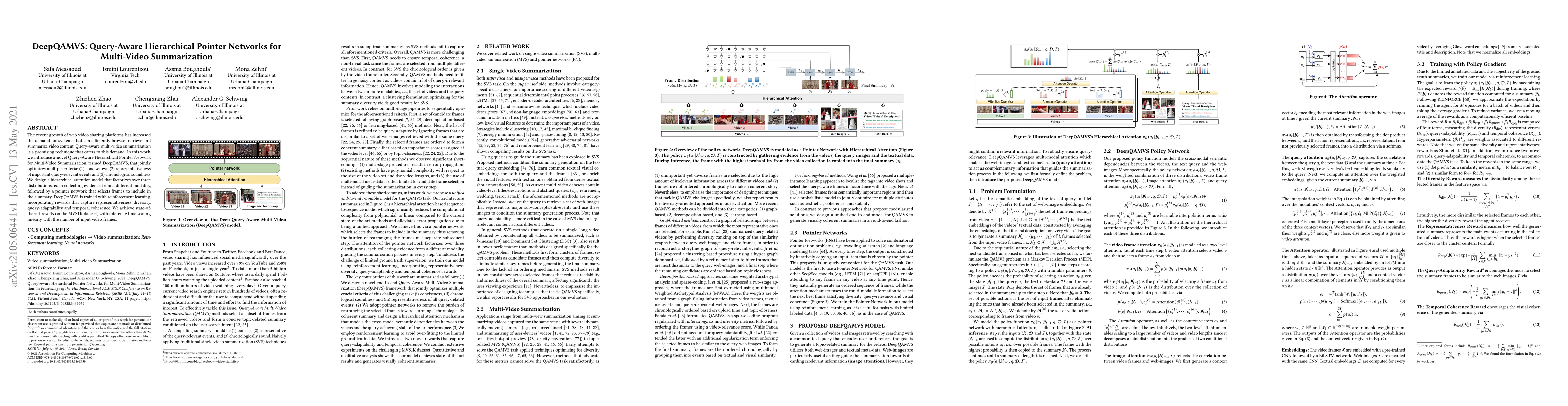 DeepQAMVS introduces a novel hierarchical pointer network for query-aware multi-video summarization, optimizing conciseness, event representativeness, and temporal coherence. It achieves state-of-the-art results on the MVS1K dataset with efficient linear scaling of inference time.