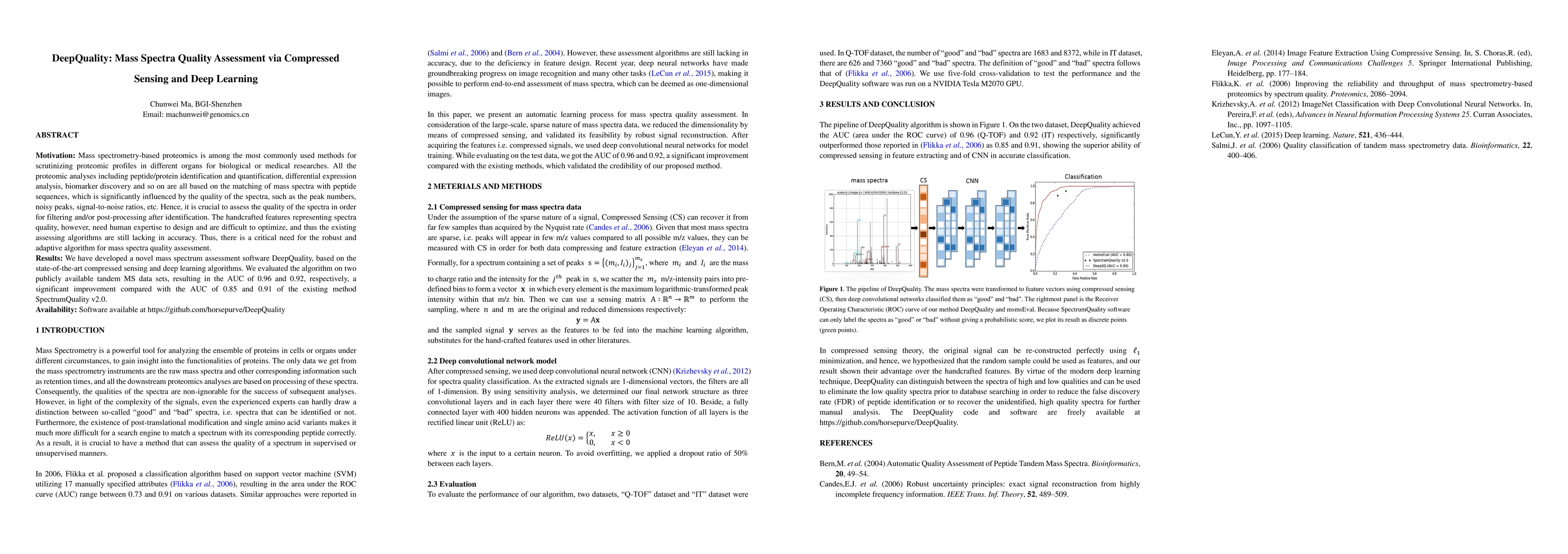 Motivation: Mass spectrometry-based proteomics is among the most commonly used methods for scrutinizing proteomic profiles in different organs for biological or medical researches. All the proteomic analyses including peptide/protein identification and quantification, differential expression analysis, biomarker discovery and so on are all based on the matching of mass spectra with peptide sequences, which is significantly influenced by the quality of the spectra, such as the peak numbers, noisy peaks, signal-to-noise ratios, etc. Hence, it is crucial to assess the quality of the spectra in order for filtering and/or post-processing after identification. The handcrafted features representing spectra quality, however, need human expertise to design and are difficult to optimize, and thus the existing assessing algorithms are still lacking in accuracy. Thus, there is a critical need for the robust and adaptive algorithm for mass spectra quality assessment. Results: We have developed a novel mass spectrum assessment software DeepQuality, based on the state-of-the-art compressed sensing and deep learning algorithms. We evaluated the algorithm on two publicly available tandem MS data sets, resulting in the AUC of 0.96 and 0.92, respectively, a significant improvement compared with the AUC of 0.85 and 0.91 of the existing method SpectrumQuality v2.0. Availability: Software available at https://github.com/horsepurve/DeepQuality