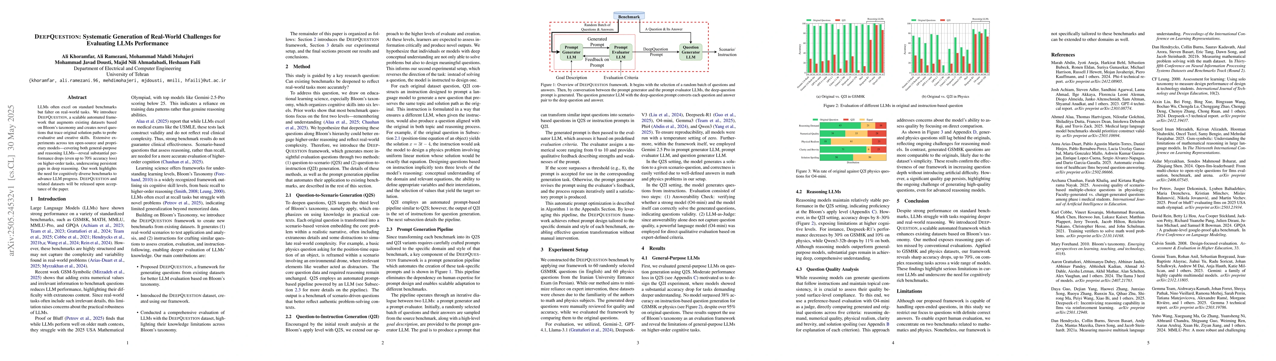 DeepQuestion, an automated framework for generating real-world challenges that systematically augment datasets and create novel questions to evaluate LLMs' performance.