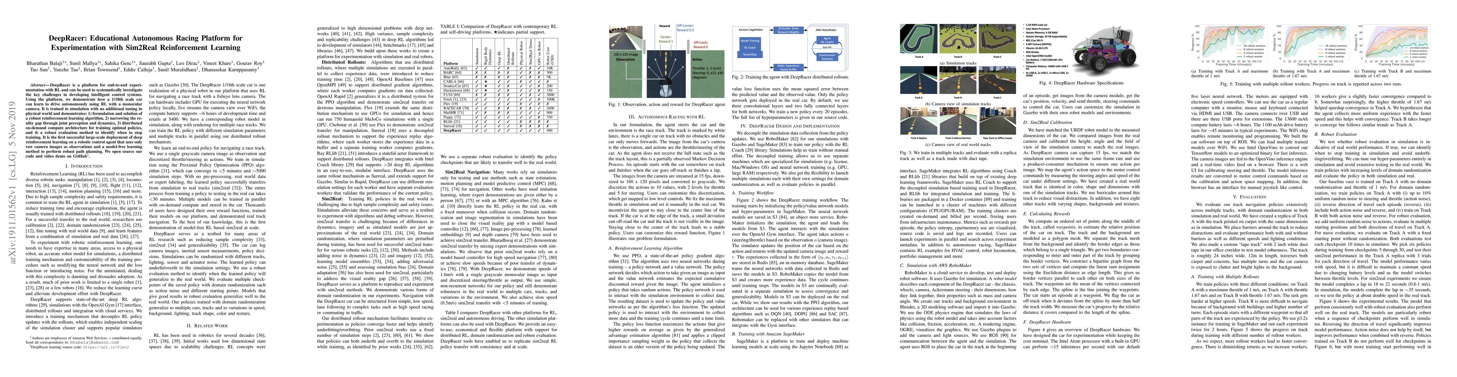 DeepRacer is an autonomous racing platform for reinforcement learning experimentation, successfully deploying a model-free RL agent trained in simulation to autonomously drive a 1/18th scale car using only camera images, showcasing robust reinforcement learning, reduced reality gap, and a distributed compute architecture.