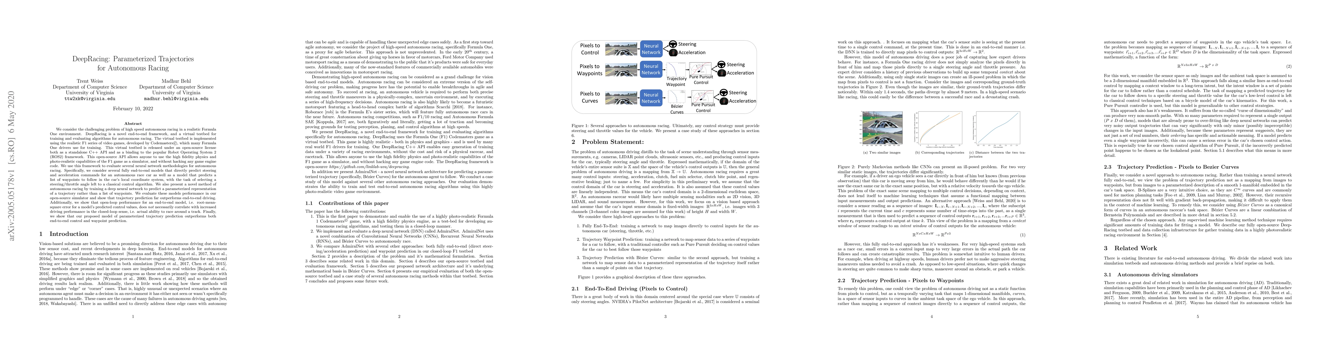We consider the challenging problem of high speed autonomous racing in a realistic Formula One environment. DeepRacing is a novel end-to-end framework, and a virtual testbed for training and evaluating algorithms for autonomous racing. The virtual testbed is implemented using the realistic F1 series of video games, developed by Codemasters, which many Formula One drivers use for training. This virtual testbed is released under an open-source license both as a standalone C++ API and as a binding to the popular Robot Operating System 2 (ROS2) framework. This open-source API allows anyone to use the high fidelity physics and photo-realistic capabilities of the F1 game as a simulator, and without hacking any game engine code. We use this framework to evaluate several neural network methodologies for autonomous racing. Specifically, we consider several fully end-to-end models that directly predict steering and acceleration commands for an autonomous race car as well as a model that predicts a list of waypoints to follow in the car's local coordinate system, with the task of selecting a steering/throttle angle left to a classical control algorithm. We also present a novel method of autonomous racing by training a deep neural network to predict a parameterized representation of a trajectory rather than a list of waypoints. We evaluate these models performance in our open-source simulator and show that trajectory prediction far outperforms end-to-end driving. Additionally, we show that open-loop performance for an end-to-end model, i.e. root-mean-square error for a model's predicted control values, does not necessarily correlate with increased driving performance in the closed-loop sense, i.e. actual ability to race around a track. Finally, we show that our proposed model of parameterized trajectory prediction outperforms both end-to-end control and waypoint prediction.