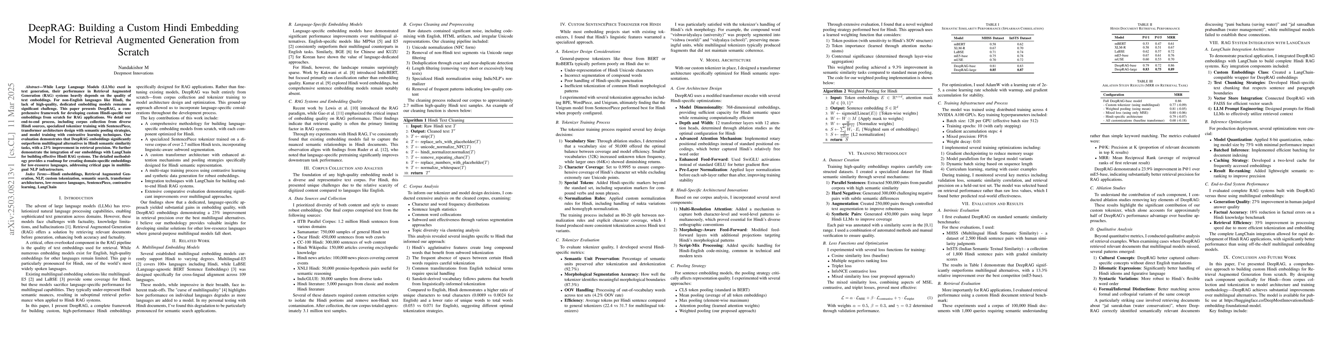 In this paper, I present our work on DeepRAG, a specialized embedding model we built specifically for Hindi language in RAG systems. While LLMs have gotten really good at generating text, their performance in retrieval tasks still depends heavily on having quality embeddings - something that's been lacking for Hindi despite being one of the world's most spoken languages. We tackled this by creating embeddings from the ground up rather than just fine-tuning existing models. Our process involved collecting diverse Hindi texts (over 2.7M samples), training a custom SentencePiece tokenizer that actually understands Hindi morphology, designing transformer architecture with Hindi-specific attention mechanisms, and optimizing with contrastive learning. Results were honestly better than I expected - we saw a 23% improvement in retrieval precision compared to the multilingual models everyone's been using. The paper details our methodology, which I think could help others working with low-resource languages where the one-size-fits-all multilingual models fall short. We've also integrated our embeddings with LangChain to build complete Hindi RAG systems, which might be useful for practitioners. While there's still tons more to explore, I believe this work addresses a critical gap for Hindi NLP and demonstrates why language-specific approaches matter.