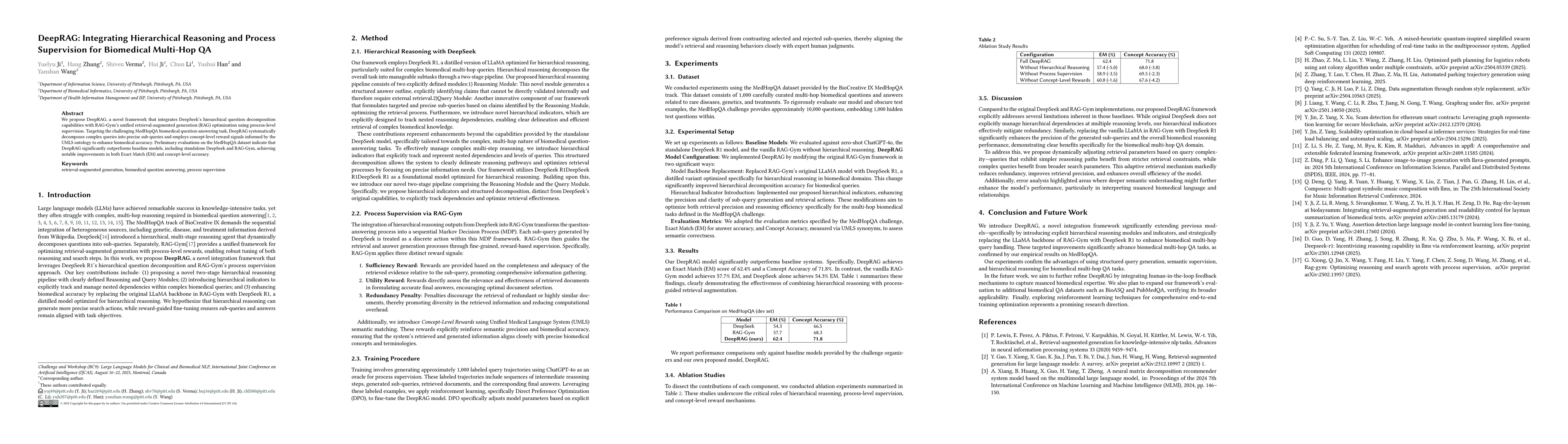 We propose DeepRAG, a novel framework that integrates DeepSeek hierarchical question decomposition capabilities with RAG Gym unified retrieval-augmented generation optimization using process level supervision. Targeting the challenging MedHopQA biomedical question answering task, DeepRAG systematically decomposes complex queries into precise sub-queries and employs concept level reward signals informed by the UMLS ontology to enhance biomedical accuracy. Preliminary evaluations on the MedHopQA dataset indicate that DeepRAG significantly outperforms baseline models, including standalone DeepSeek and RAG Gym, achieving notable improvements in both Exact Match and concept level accuracy.