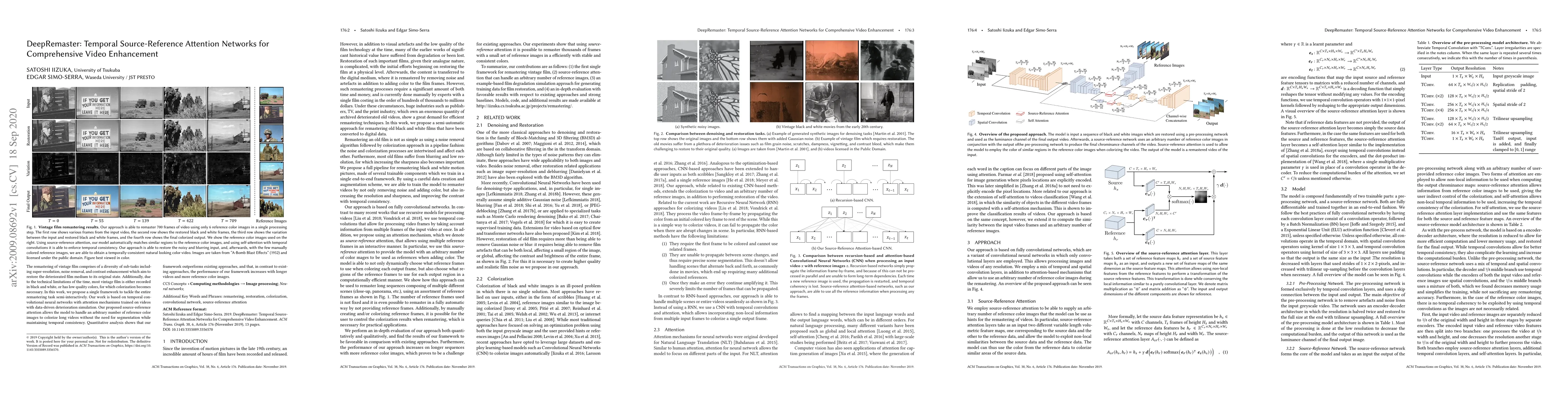 The remastering of vintage film comprises of a diversity of sub-tasks including super-resolution, noise removal, and contrast enhancement which aim to restore the deteriorated film medium to its original state. Additionally, due to the technical limitations of the time, most vintage film is either recorded in black and white, or has low quality colors, for which colorization becomes necessary. In this work, we propose a single framework to tackle the entire remastering task semi-interactively. Our work is based on temporal convolutional neural networks with attention mechanisms trained on videos with data-driven deterioration simulation. Our proposed source-reference attention allows the model to handle an arbitrary number of reference color images to colorize long videos without the need for segmentation while maintaining temporal consistency. Quantitative analysis shows that our framework outperforms existing approaches, and that, in contrast to existing approaches, the performance of our framework increases with longer videos and more reference color images.