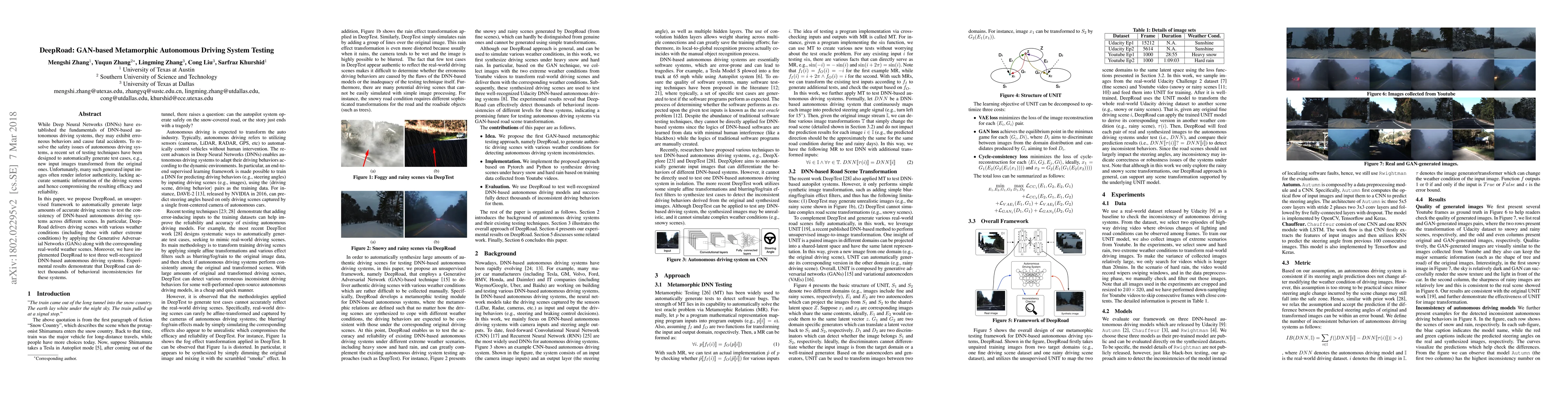 DeepRoad is an unsupervised framework using Generative Adversarial Networks (GANs) to generate realistic driving scenes for testing DNN-based autonomous driving systems. It successfully identifies thousands of behavioral inconsistencies in tested systems by simulating various weather conditions.