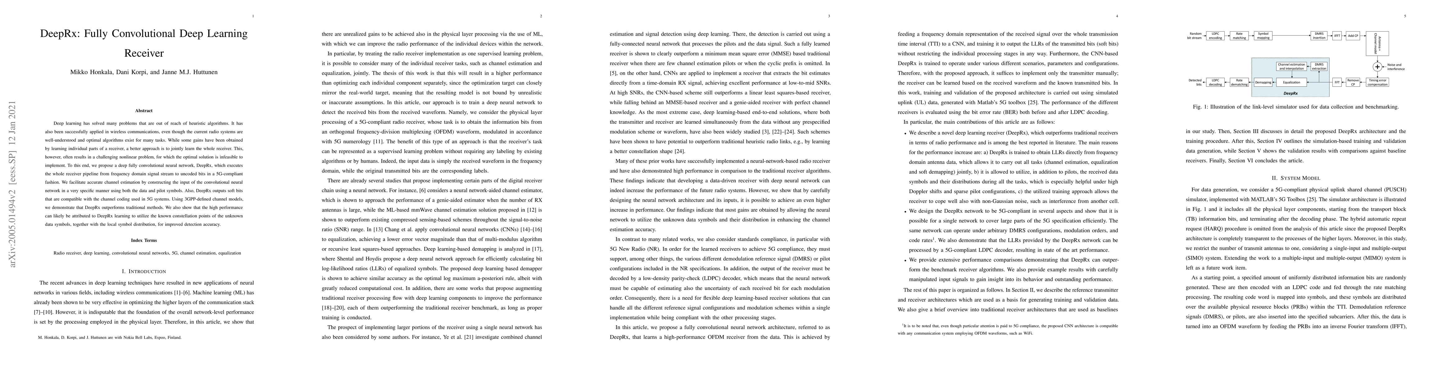 DeepRx employs a fully convolutional deep learning network to jointly learn the entire receiver pipeline for 5G systems, outperforming traditional methods by leveraging known constellation points and local symbol distribution for enhanced detection accuracy. This approach is demonstrated to be effective using 3GPP-defined channel models.