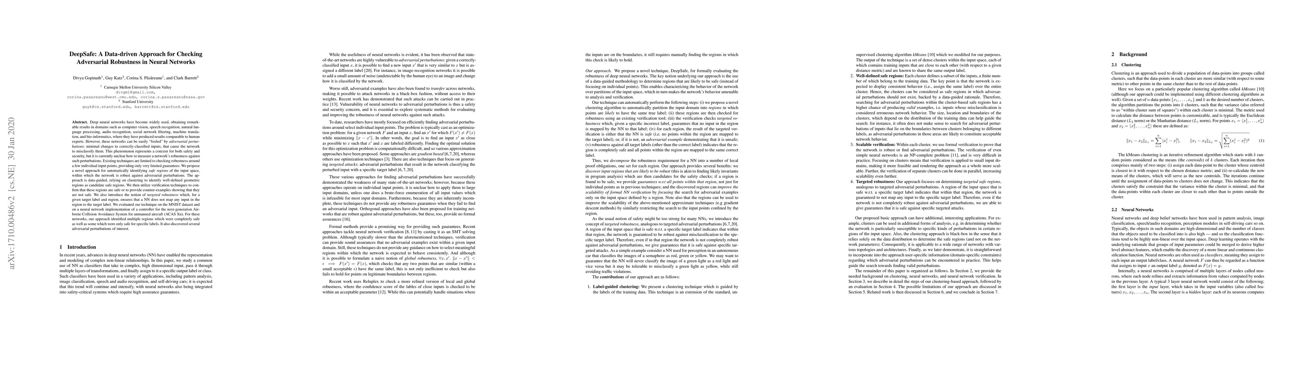 Deep neural networks have become widely used, obtaining remarkable results in domains such as computer vision, speech recognition, natural language processing, audio recognition, social network filtering, machine translation, and bio-informatics, where they have produced results comparable to human experts. However, these networks can be easily fooled by adversarial perturbations: minimal changes to correctly-classified inputs, that cause the network to mis-classify them. This phenomenon represents a concern for both safety and security, but it is currently unclear how to measure a network's robustness against such perturbations. Existing techniques are limited to checking robustness around a few individual input points, providing only very limited guarantees. We propose a novel approach for automatically identifying safe regions of the input space, within which the network is robust against adversarial perturbations. The approach is data-guided, relying on clustering to identify well-defined geometric regions as candidate safe regions. We then utilize verification techniques to confirm that these regions are safe or to provide counter-examples showing that they are not safe. We also introduce the notion of targeted robustness which, for a given target label and region, ensures that a NN does not map any input in the region to the target label. We evaluated our technique on the MNIST dataset and on a neural network implementation of a controller for the next-generation Airborne Collision Avoidance System for unmanned aircraft (ACAS Xu). For these networks, our approach identified multiple regions which were completely safe as well as some which were only safe for specific labels. It also discovered several adversarial perturbations of interest.