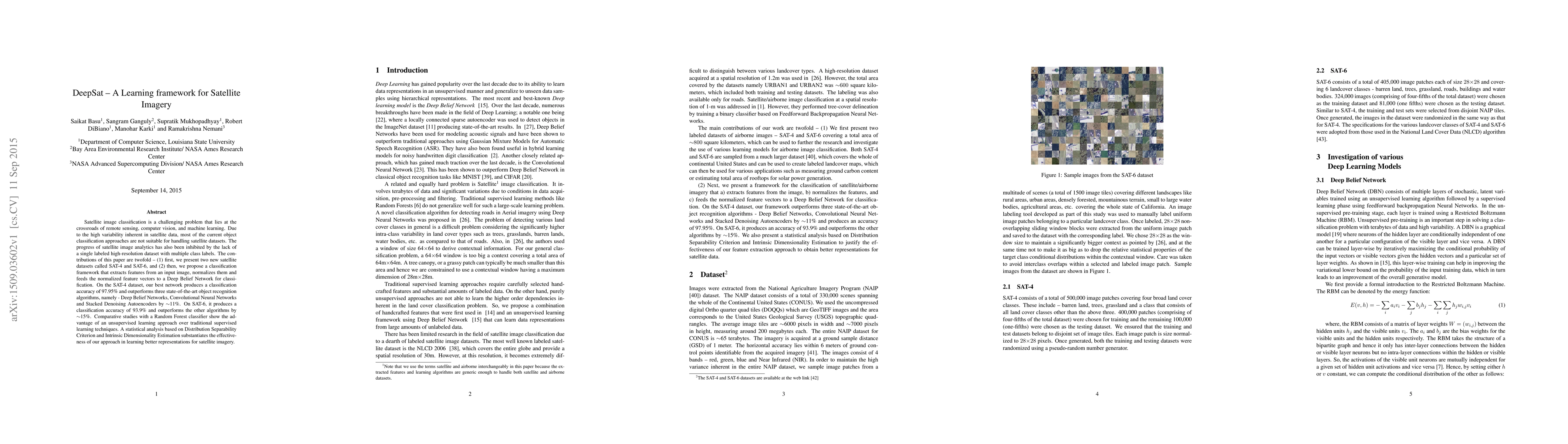 This paper introduces two new satellite datasets, SAT-4 and SAT-6, and proposes a Deep Belief Network-based classification framework that outperforms existing state-of-the-art algorithms in satellite image classification, achieving accuracies of 97.95% and 93.9% respectively. The study also highlights the benefits of unsupervised learning over traditional supervised methods.