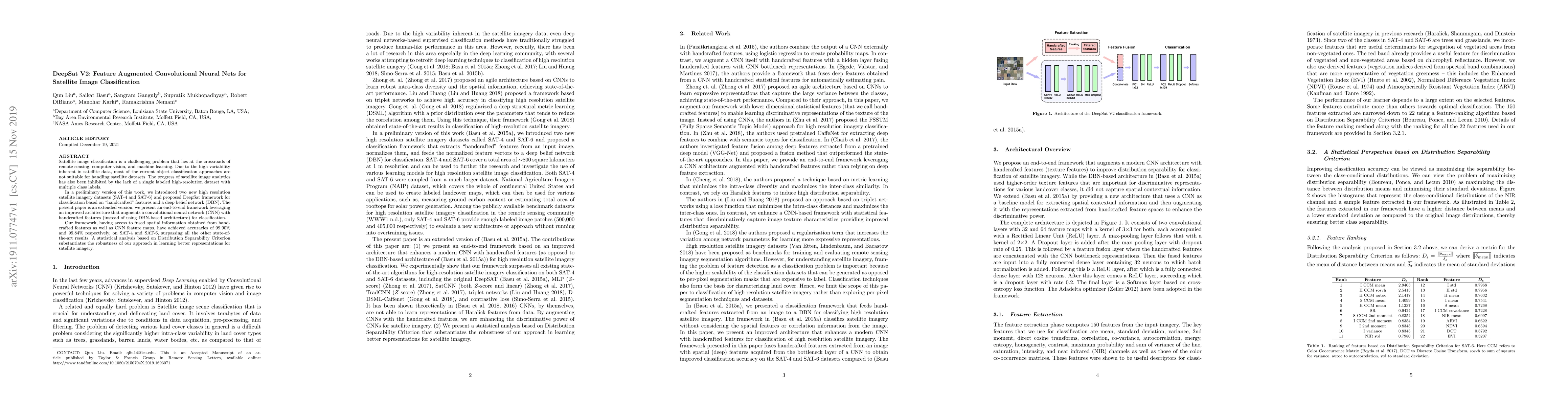 Satellite image classification is a challenging problem that lies at the crossroads of remote sensing, computer vision, and machine learning. Due to the high variability inherent in satellite data, most of the current object classification approaches are not suitable for handling satellite datasets. The progress of satellite image analytics has also been inhibited by the lack of a single labeled high-resolution dataset with multiple class labels. In a preliminary version of this work, we introduced two new high resolution satellite imagery datasets (SAT-4 and SAT-6) and proposed DeepSat framework for classification based on "handcrafted" features and a deep belief network (DBN). The present paper is an extended version, we present an end-to-end framework leveraging an improved architecture that augments a convolutional neural network (CNN) with handcrafted features (instead of using DBN-based architecture) for classification. Our framework, having access to fused spatial information obtained from handcrafted features as well as CNN feature maps, have achieved accuracies of 99.90% and 99.84% respectively, on SAT-4 and SAT-6, surpassing all the other state-of-the-art results. A statistical analysis based on Distribution Separability Criterion substantiates the robustness of our approach in learning better representations for satellite imagery.