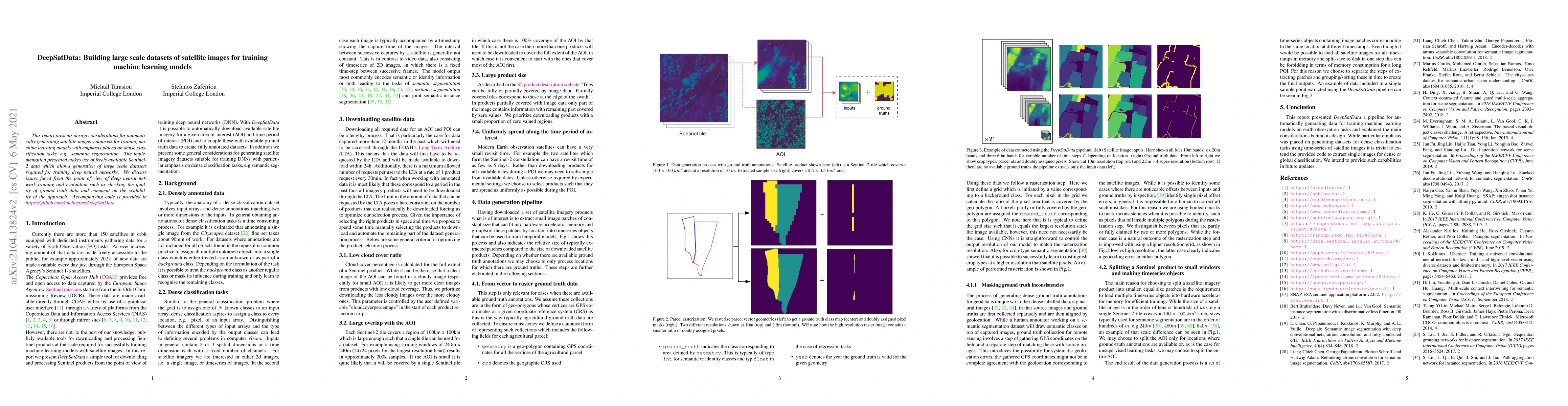 This report presents design considerations for automatically generating satellite imagery datasets for training machine learning models with emphasis placed on dense classification tasks, e.g. semantic segmentation. The implementation presented makes use of freely available Sentinel-2 data which allows generation of large scale datasets required for training deep neural networks. We discuss issues faced from the point of view of deep neural network training and evaluation such as checking the quality of ground truth data and comment on the scalability of the approach. Accompanying code is provided in https://github.com/michaeltrs/DeepSatData.