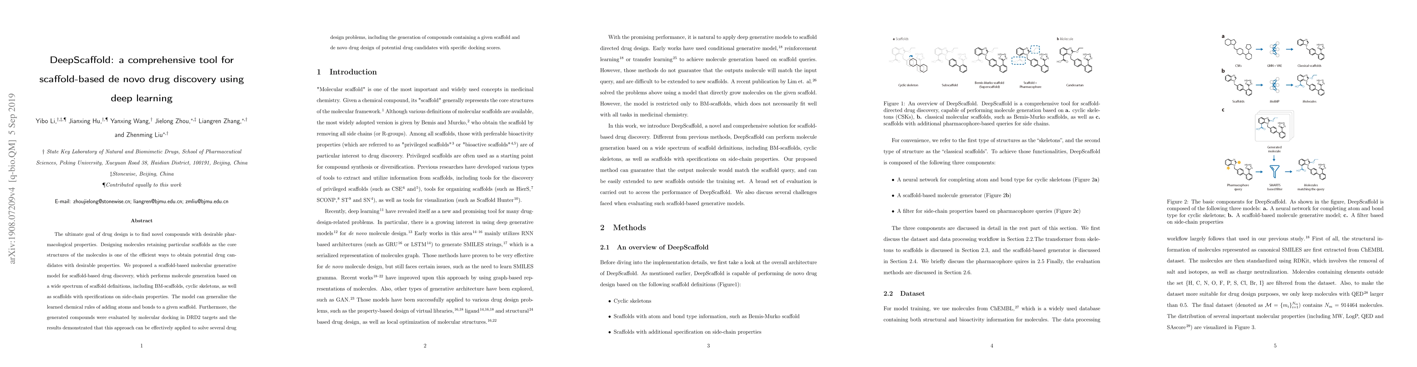 DeepScaffold is a deep learning-based tool for scaffold-based de novo drug discovery, generating novel compounds by adding atoms and bonds to predefined scaffolds. The model was validated through molecular docking against DRD2 targets, demonstrating its efficacy in scaffold-based drug design and potential drug candidate generation.